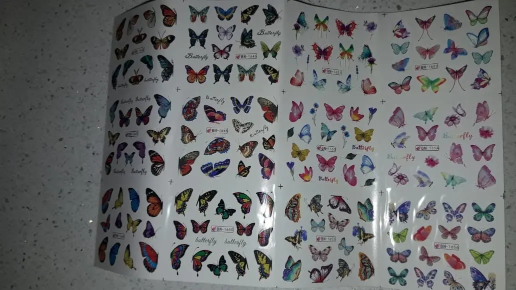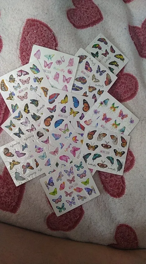 очень долго шли наклейки, около двух месяцев. бабочки огромные. это не на один ноготь даже..