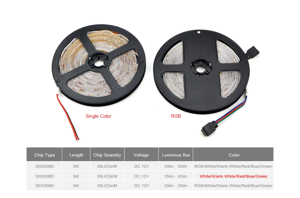 Светодиодная лента 5050, 5630, 2835, RGB, 12 В, 5 м, гибкая, водонепроницаемая, 300, Светодиодная лента, 60 светодиодовм