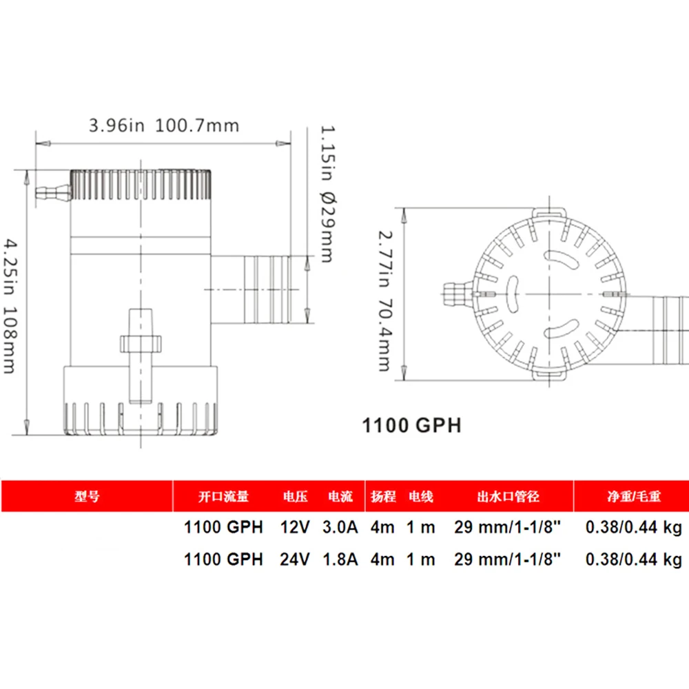 2. Выход: Трюмный насос, 500GPH, 750GPH и 1100 GPH для ваших опций, Макс. Рекомендуемая разрядная головка 3 м, 6 м3/ч.