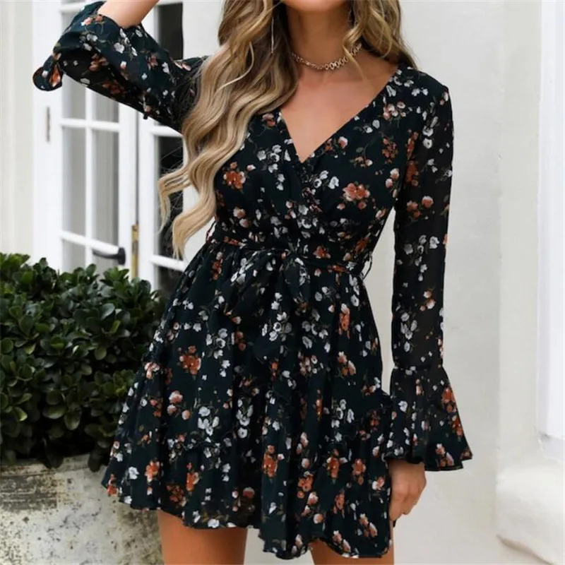 Женское платье с запахом, Осеннее цветочное мини-платье в стиле бохо, сексуальное Свободное платье с V-образным вырезом и принтом, Женский праздничный пляжный элегантный винтажный сарафан, Новинка