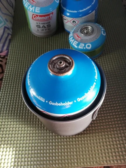 Standard gas balon 230gr can easy match this pot, the bigger one 450 gr can not be closed with the lock. I searched a lot to find exact size. But it seems it's the best option on aliexpress if you want to save space. Seems measured good. The handholders are not tight enough and lock does not seat very tight. Anyway it's the best option for me. Seller did not answer my question on chat.