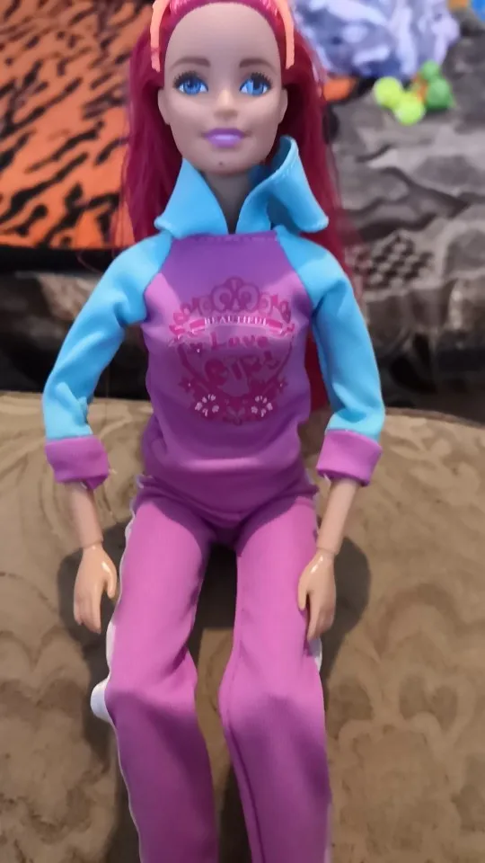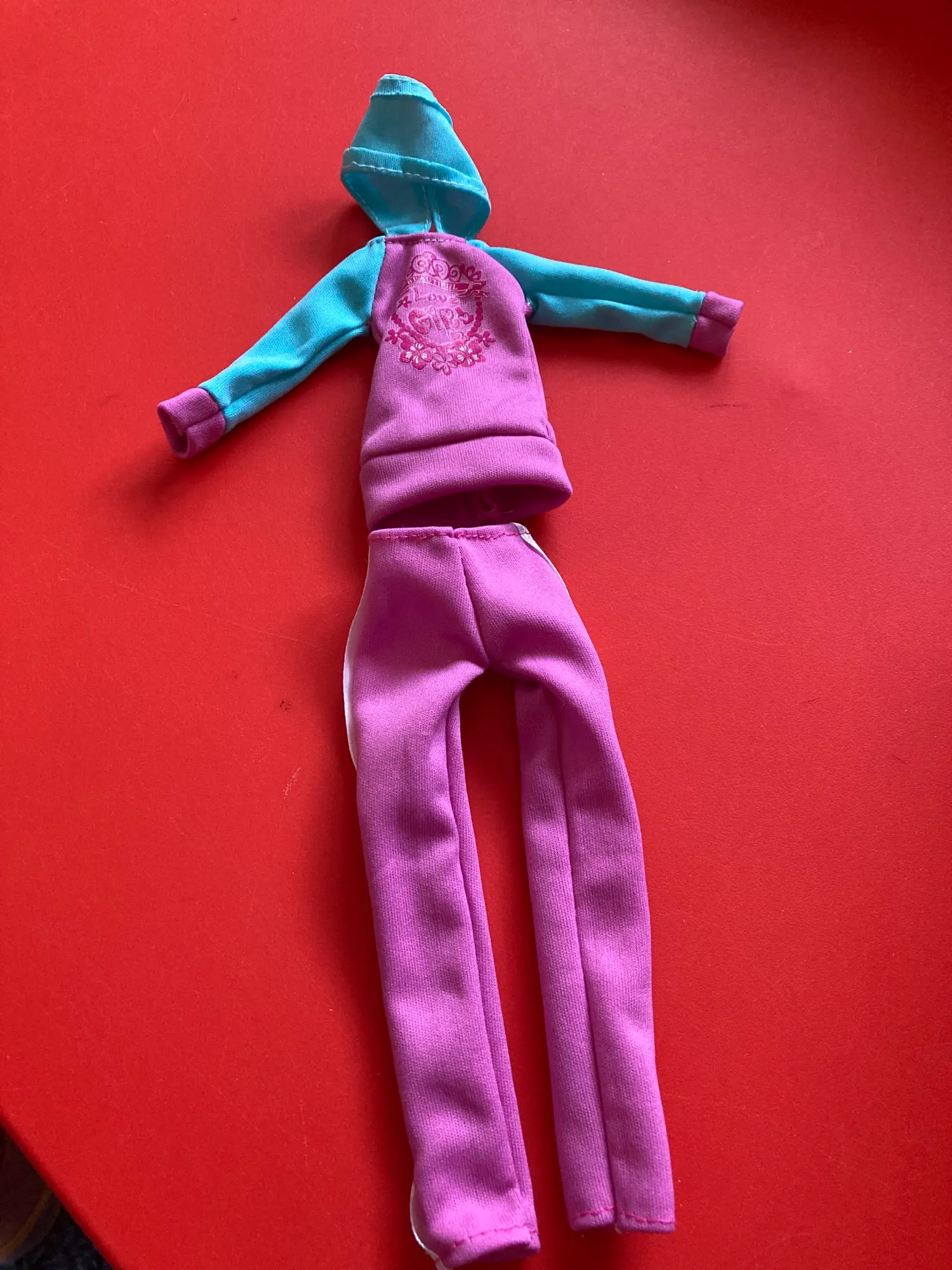 костюм хороший, сшит аккуратно. швы обработала пламенем зажигалки. на худенькую куклу Барби одели без труда.