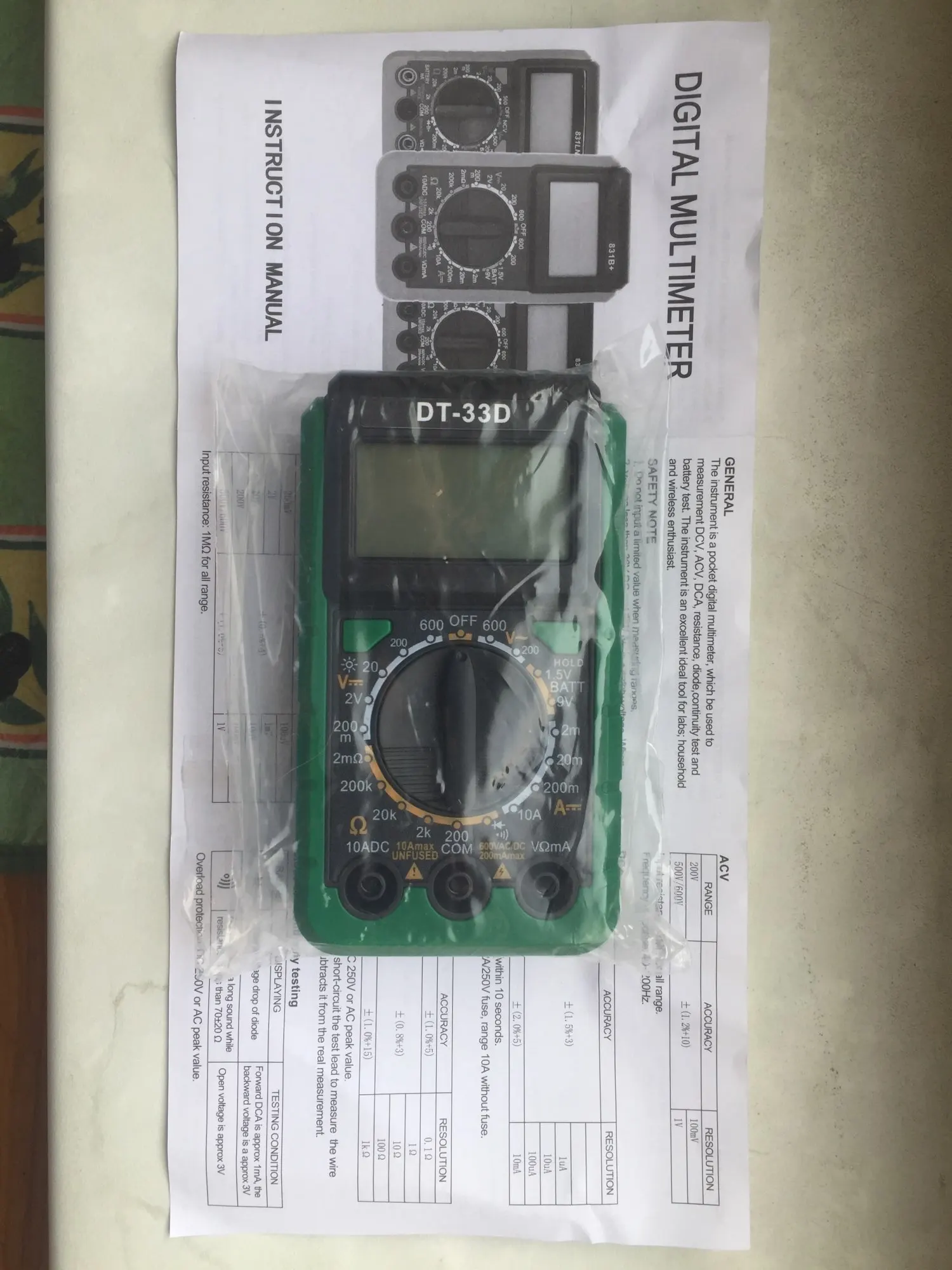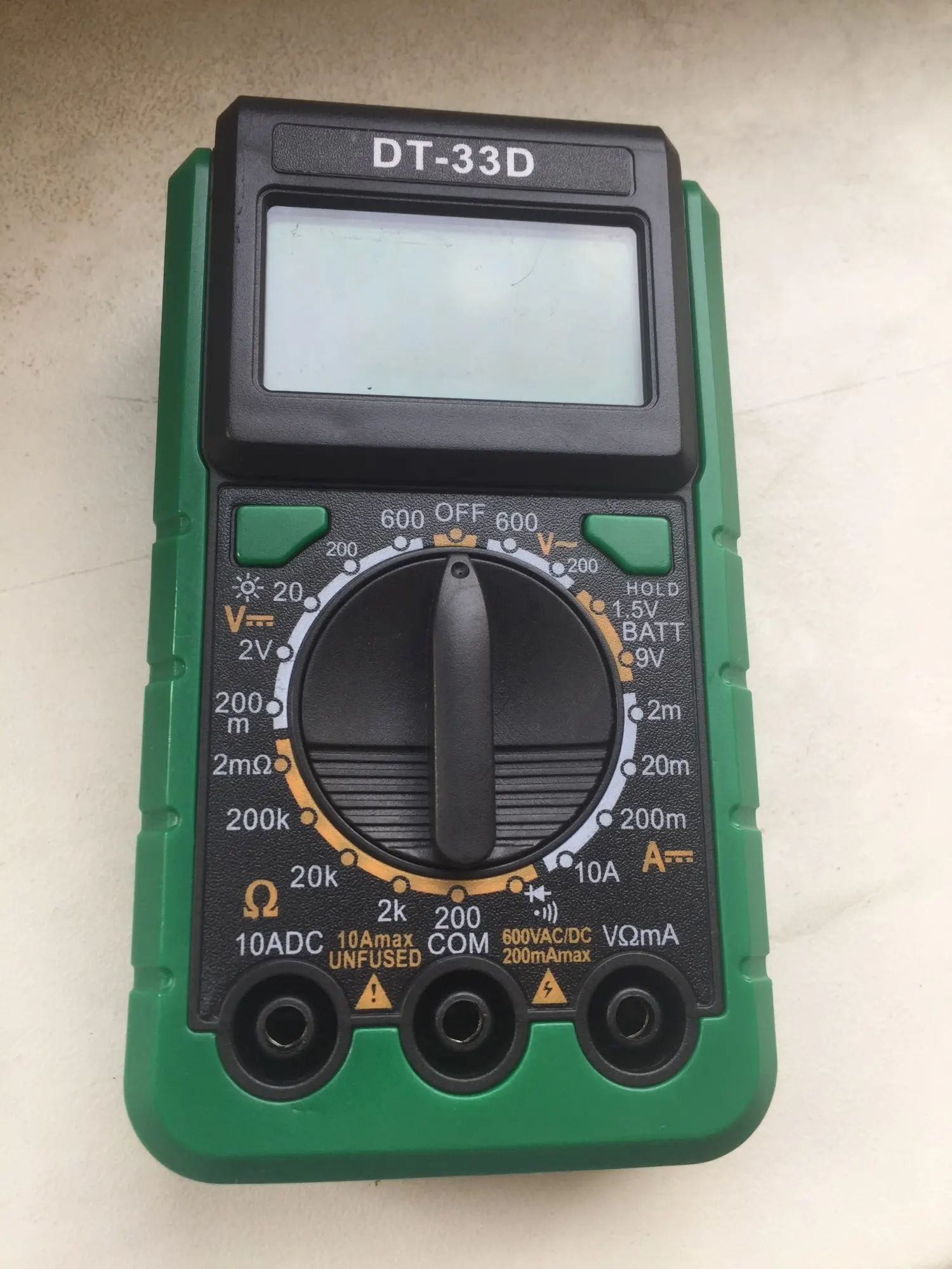 Очень хороший, Маленький цифровой мультиметр (зеленый/черный, с зеленым освещением), модель DT-33D. Работает с парой аккумуляторов AAA (не входят в комплект). Очень деликатная и очень быстрая доставка в Москву, Россию,-прибыл в почтовое отделение в течение трех недель, полностью отслеживается. Я рекомендую этот магазин.