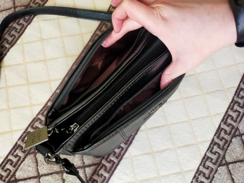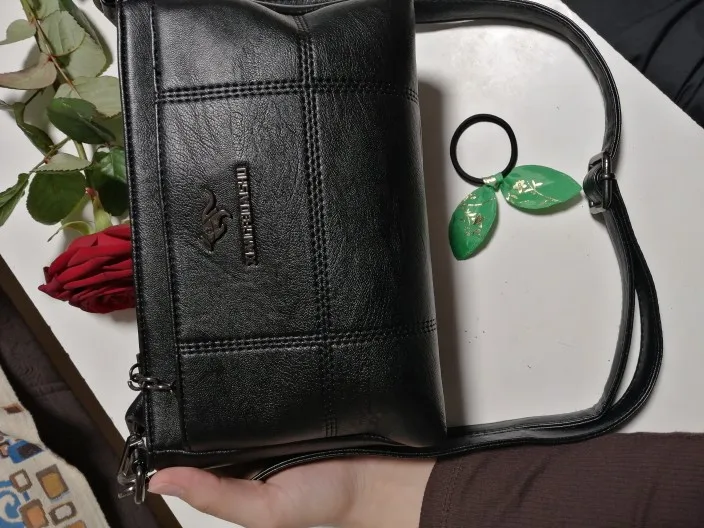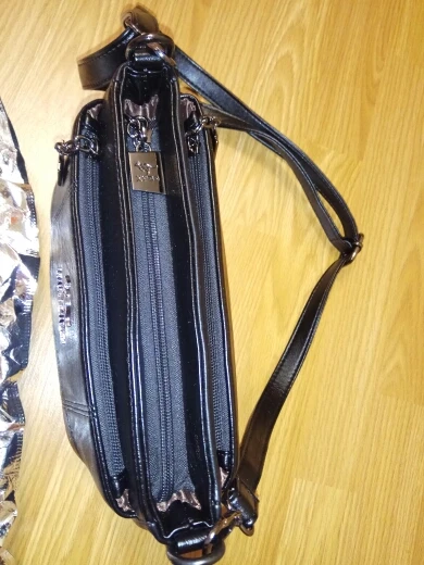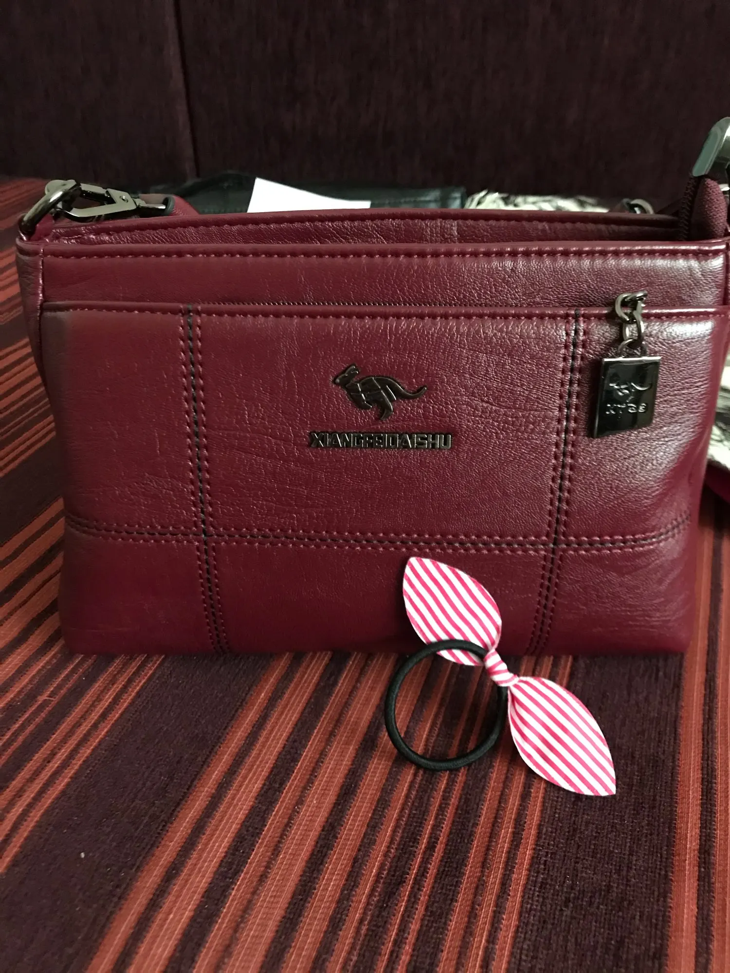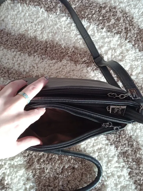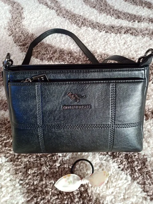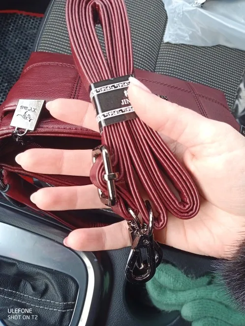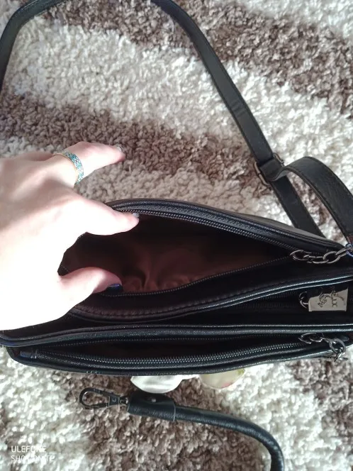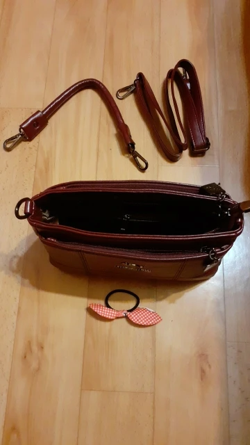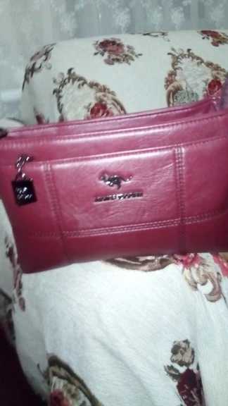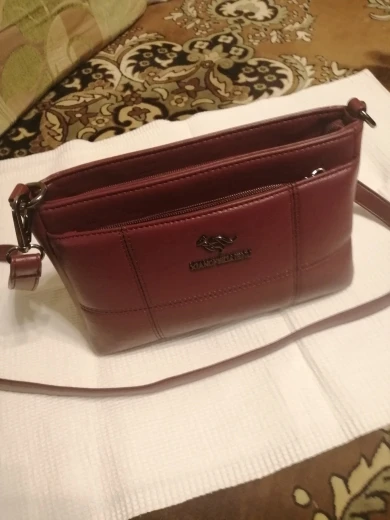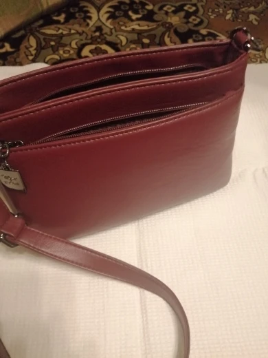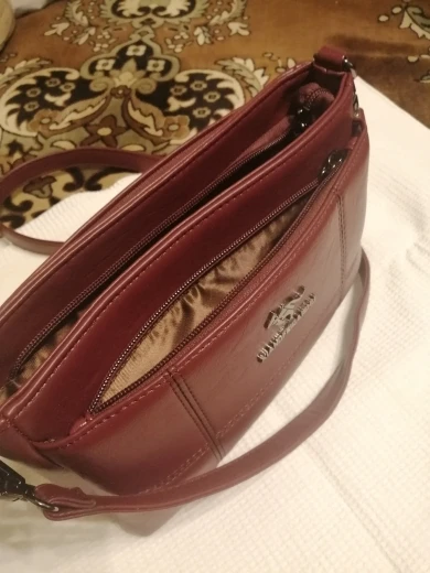 сумочка приятная на ощупь, лёгкая,удобная, хоть и не кожа,но смотрится прилично,два ремешка, теперь думаю что надо было заказать бордовую, очень много отделений с замочками,молнии не яркие, мне понравилось, спасибо продавцу и спасибо за подарок.