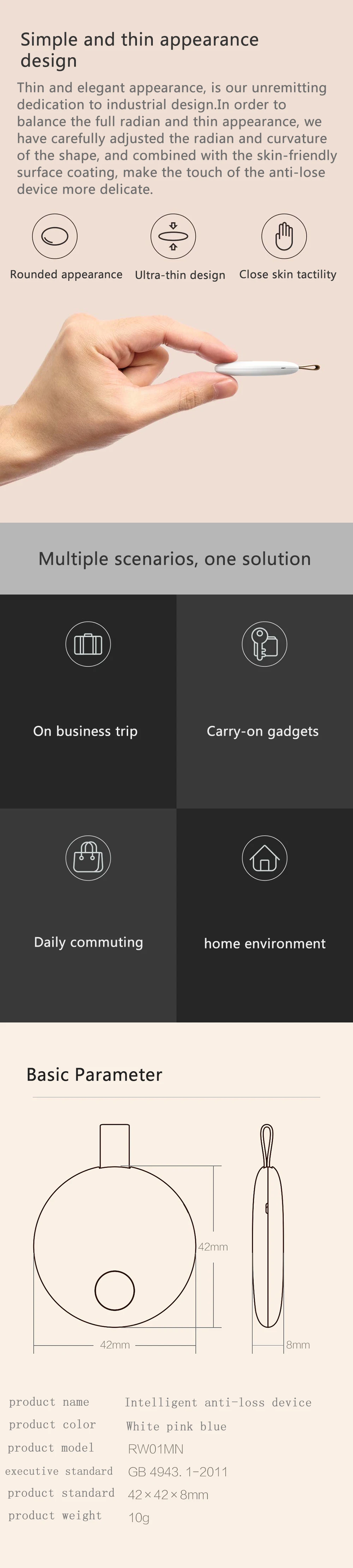 Тонкий дизайн защита от потери напоминание двусторонний взаимный поиск супер-долгий режим ожидания спецификация: Название продукта: Ranres интеллектуальное устройство против потери Модель продукта: RW01MN Материал изделия: белый, розовый, синий размер изделия: 42x42x8 мм Вес изделия: 10 г
