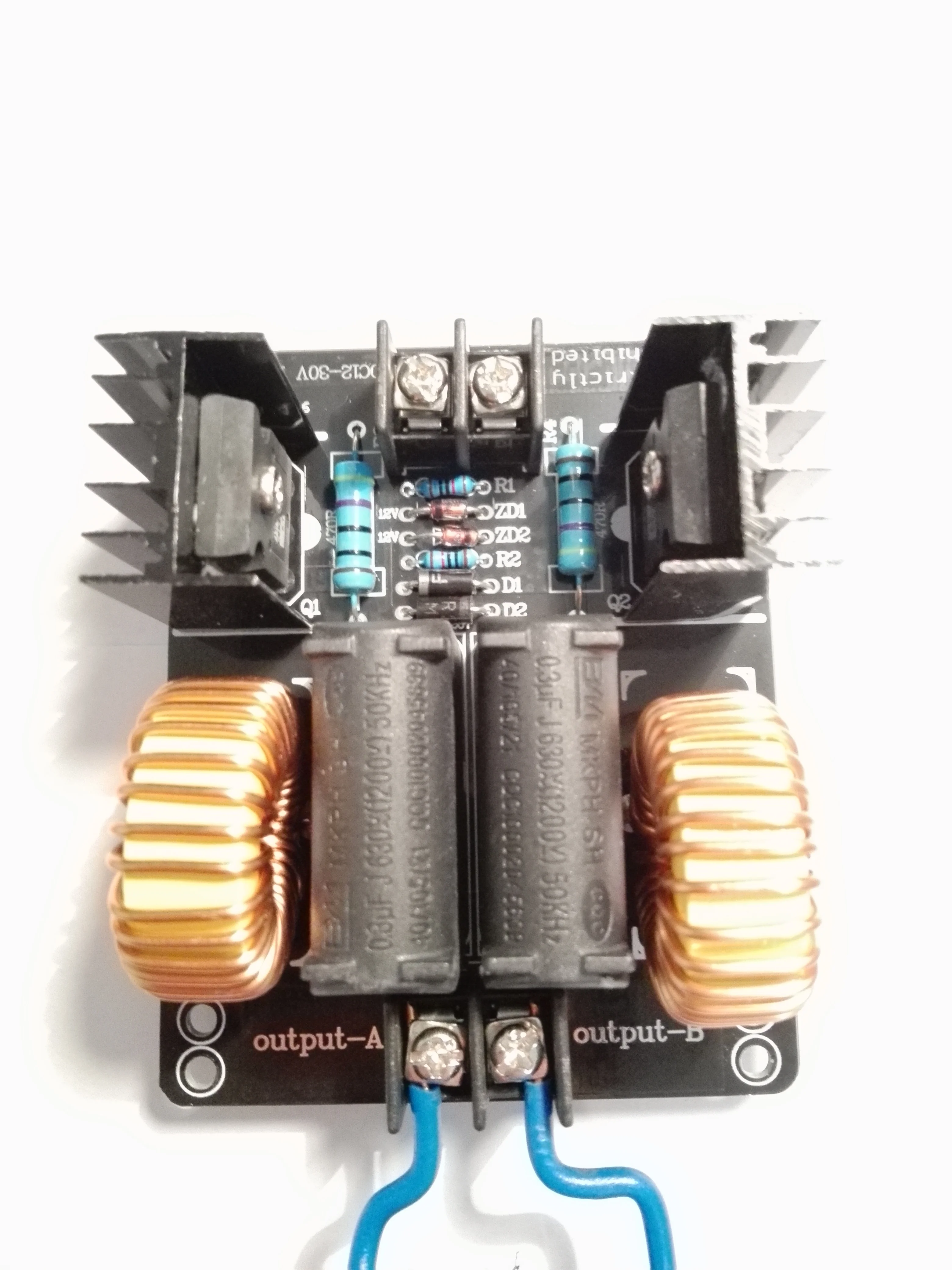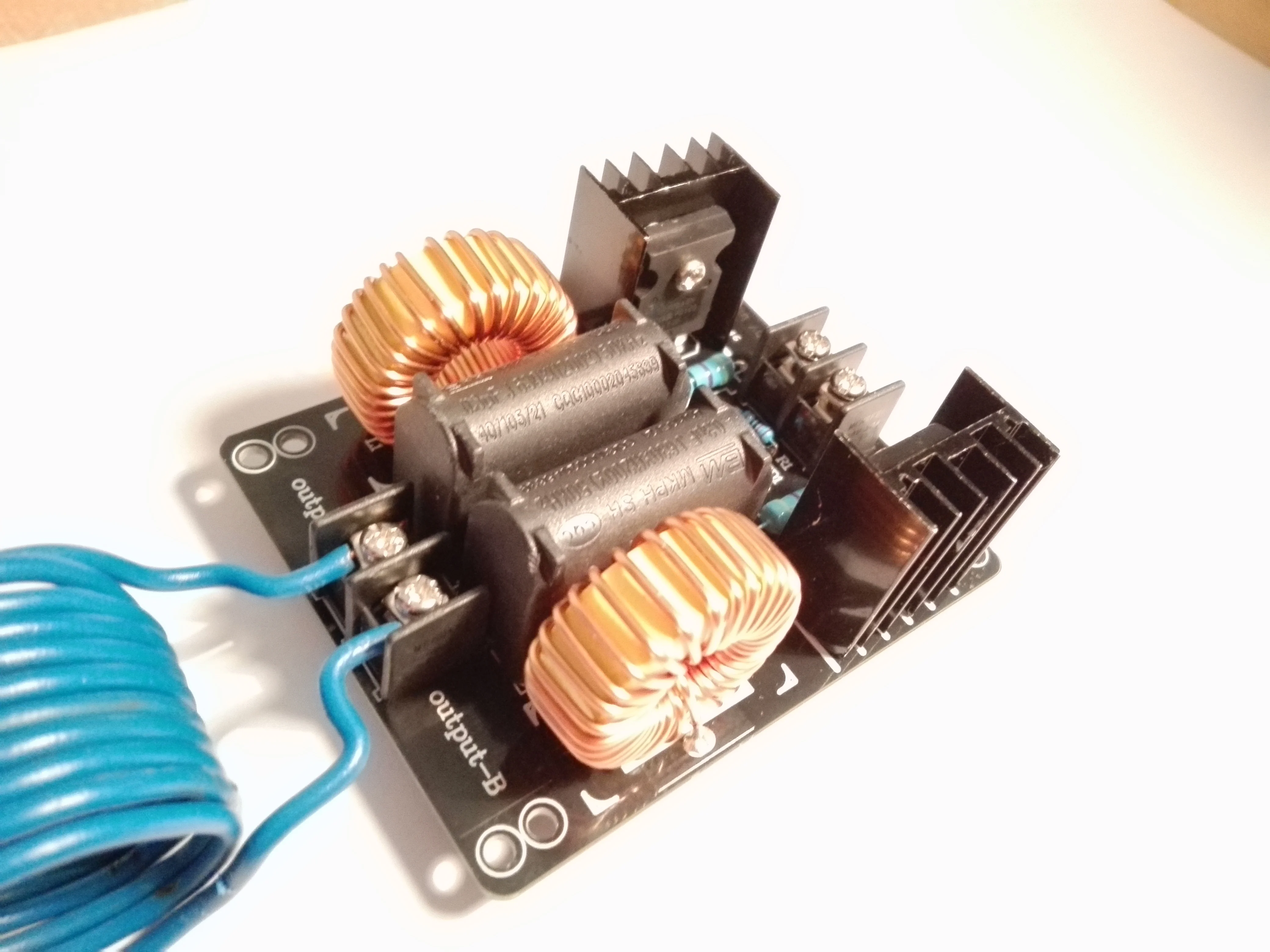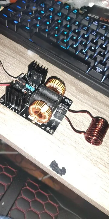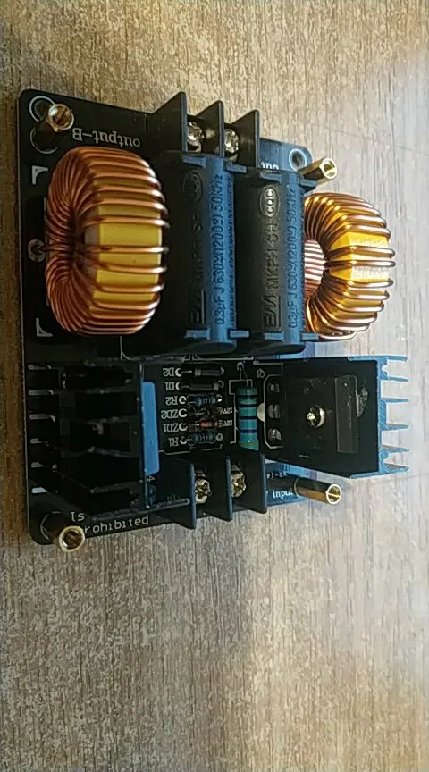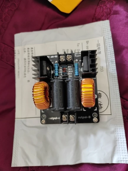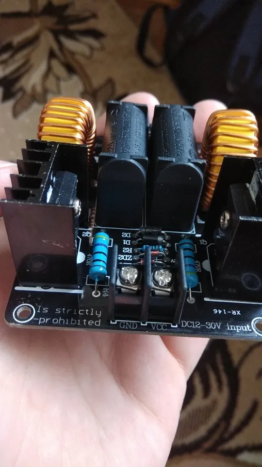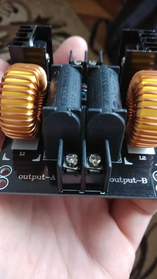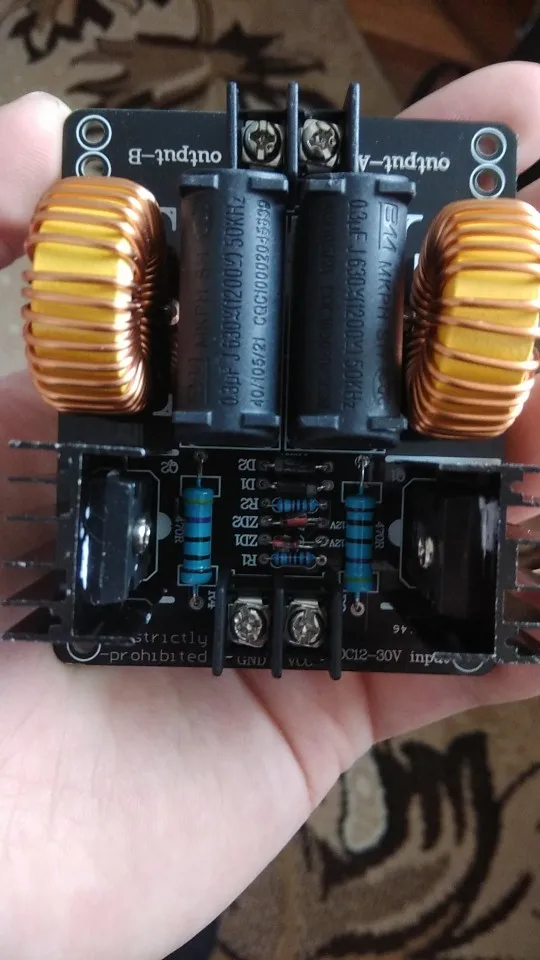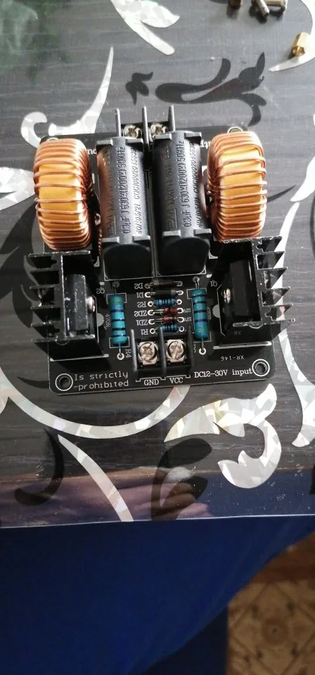 Плата пришла в нерабочем состоянии, изучая фотографии нашел что вместо стебилитрона поставили резистор, заменил на стабилитрон. запустилась но очень греется одна половина платы. через 5 сек работы вхолостую с платы идет дым. через 10 секунд работы под нагрузкой нагрело отвертку докрасна но приэтом отпаялся разъем катушки, у него тонкие проводки. впаял туда мощные клеммы. несмотря на то что во время работы напряжение не превышало 30вольт а ток 6а а устройство потребляло 180ВТ плата страшно греется. возможно у моей еще какаято неисправность. посмотрел на другие киловатные генераторы у них по 6 конденсаторов идет. а тут всего два. Мой вывод палево полное, ватты китайские считайте 1 к 10.