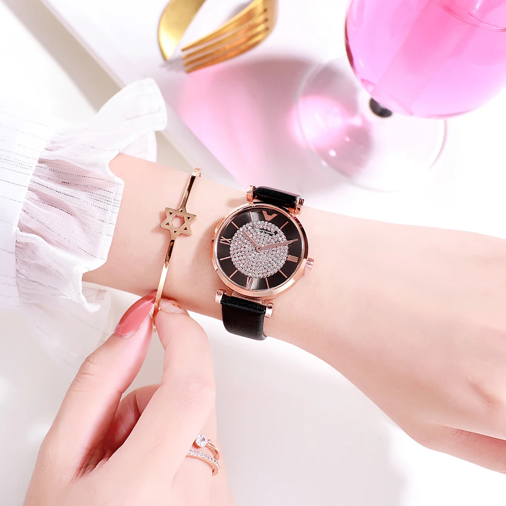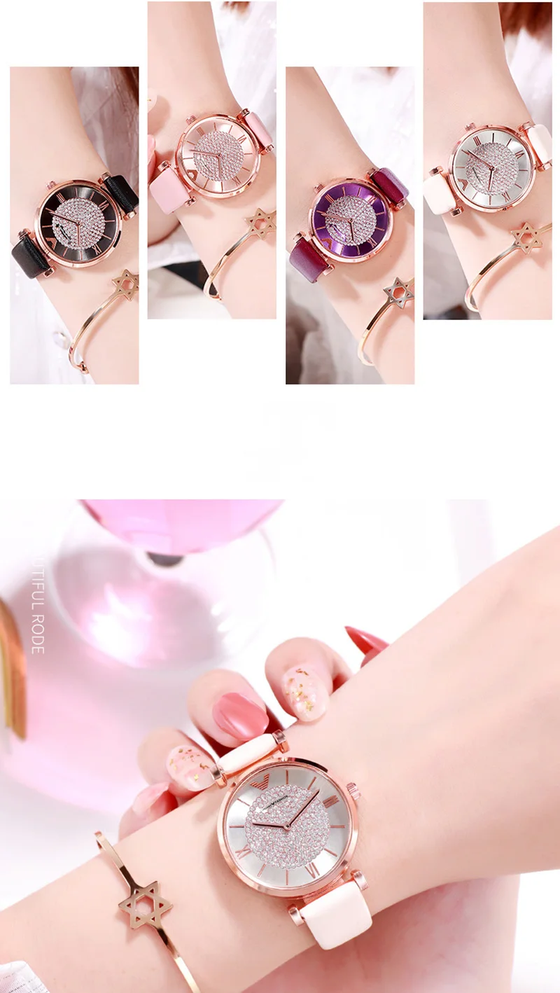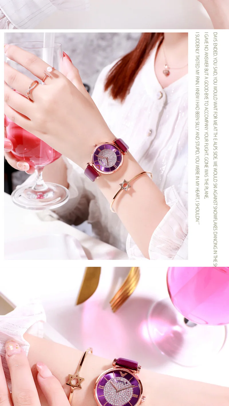 Женские наручные часы, роскошные часы с кожаным ремешком, стразы, аналоговые, красные, фиолетовые, кварцевые, 2019