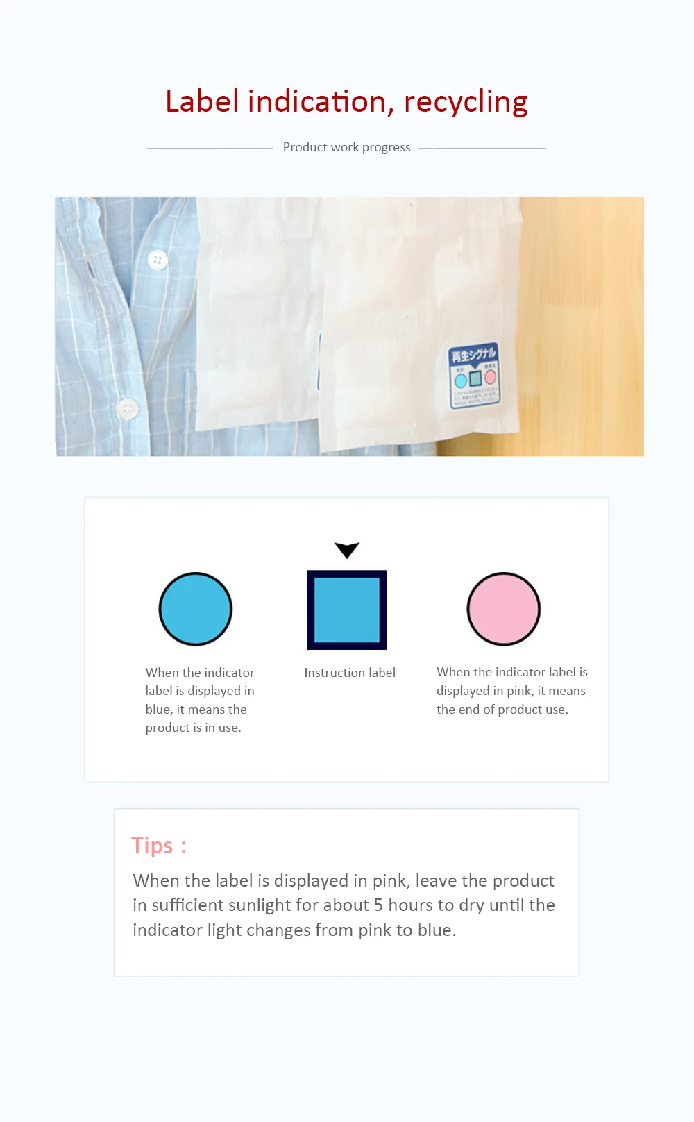Когда индикаторная табличка отображается синим цветом, это означает, что продукт используется.Когда индикаторная табличка отображается в розовом цвете, это означает конец использования продукта.Когда этикетка розовая, оставьте изделие в достаточном солнечном свете около 5 часов, чтобы высушить, пока индикатор не изменится от розового до синего.