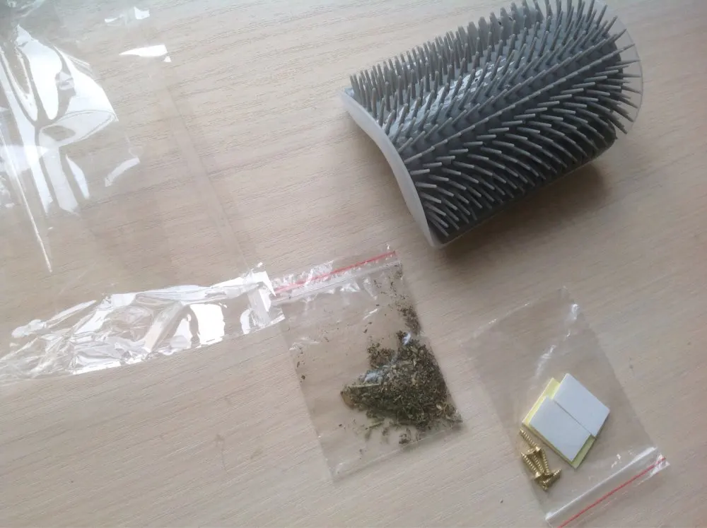 пришло быстро. В комплекте есть скотч двусторонний 4 штучки и 4 штуки самореза маленьких, а еще в пакетике кошачья мята