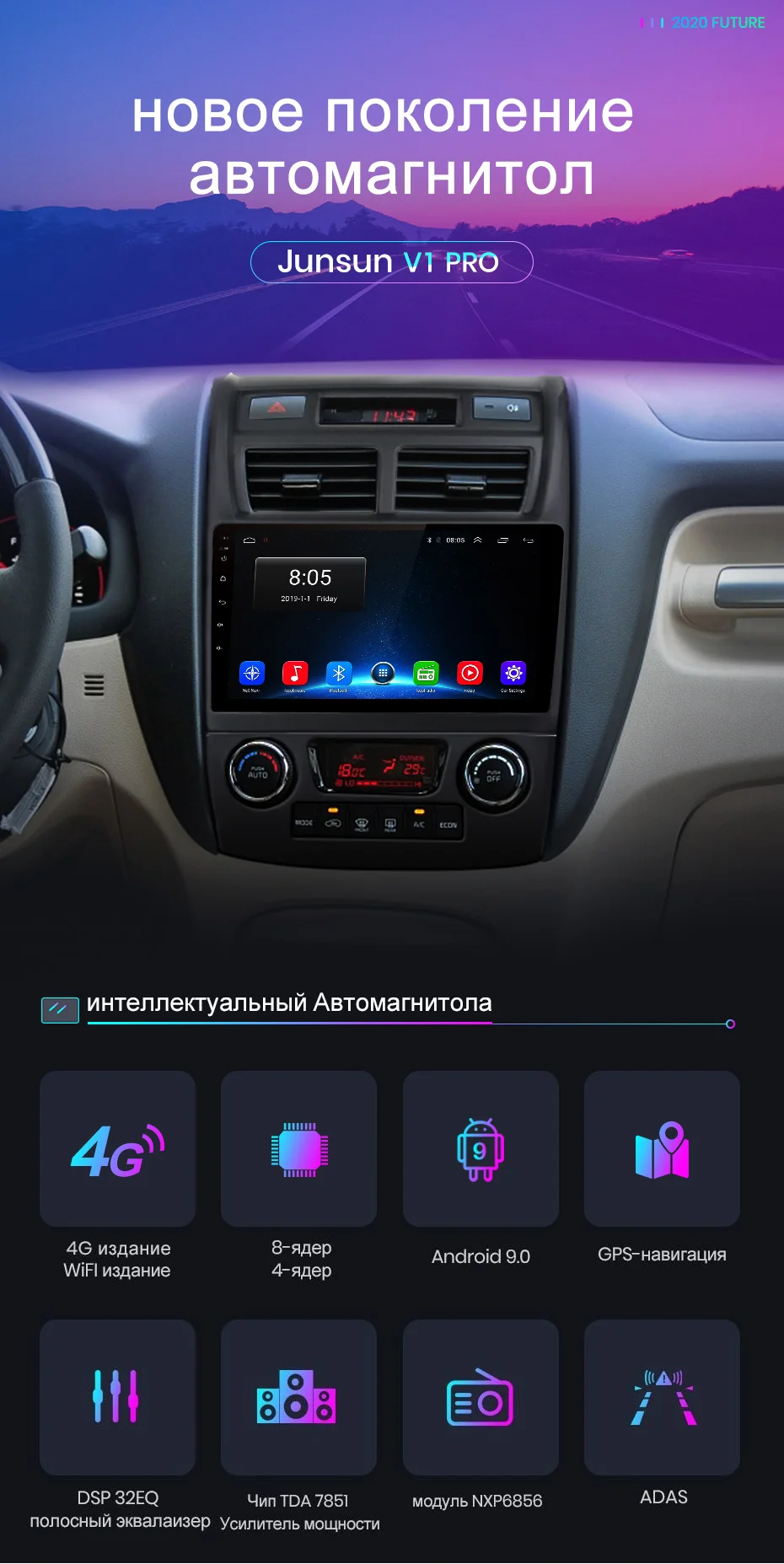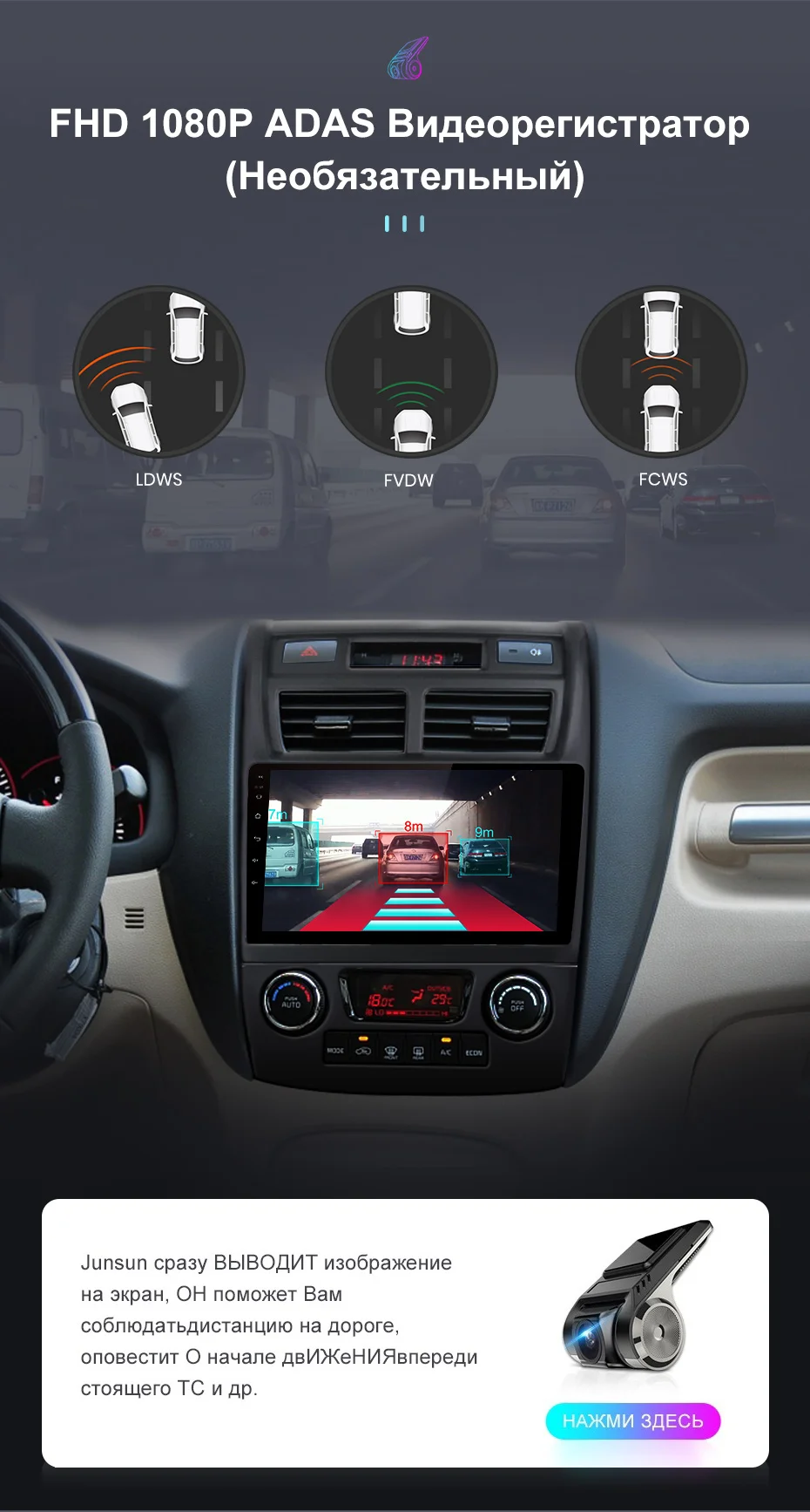 > Основные функции: Android 10.0 + 9-дюймовый IPS-экран + четырехъядерный процессор 1,2GHZ (восемь ядер 1,8 GHZ можно выбрать) + флэш-память DDR3 1 ГБ (2 ГБ / 4 ГБ / 128 ГБ можно выбрать) + 16 ГБ памяти (32 ГБ / 64 ГБ / 128 ГБ можно выбрать) + WIFI ( Сеть 4G можно выбрать) + Зеркальное соединение + Управление рулевым колесом + RDS / DSP ( можно выбрать)Специальные функции:1. PIN к PIN: кабель питания радио Junsun - это PIN к PIN, прост в установке;2. Встроенный Carplay / Android Auto: версия V1 поддерживает Android auto, версия V1 Pro поддерживает Android auto и carplay.Используйте телефонный кабель, подключите его, стабильный и простой в использовании;3. Поддержка подголовника: поддержка только версии Junsun V1;Дополнительные аксессуары> Управление голосом AI: просто скажите командное слово, управляйте магнитола без рук, сделайте вождение более безопасным> Камера ADAS DVR, мониторинг давления в шинах, OBD2, внешний микрофон, кабель RCA;