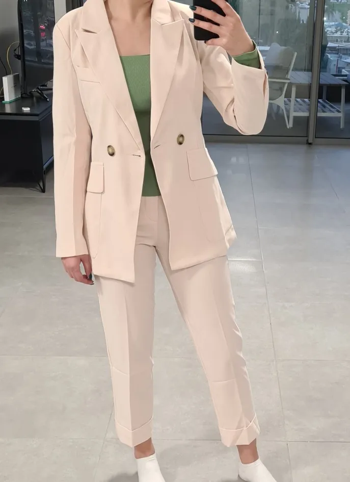 Размер не подошел. Хотя другой костюм у этого же продавца этого же размера сел хорошо. Сшито не очень - плечи как будто стягивает и спереди жакет морщинился из-за этого. Может, потому что был мал, но кажется, что такой пошив. От зары отличается и тканью, и пошивом, хотя по фото продавца похоже. Оформила возврат