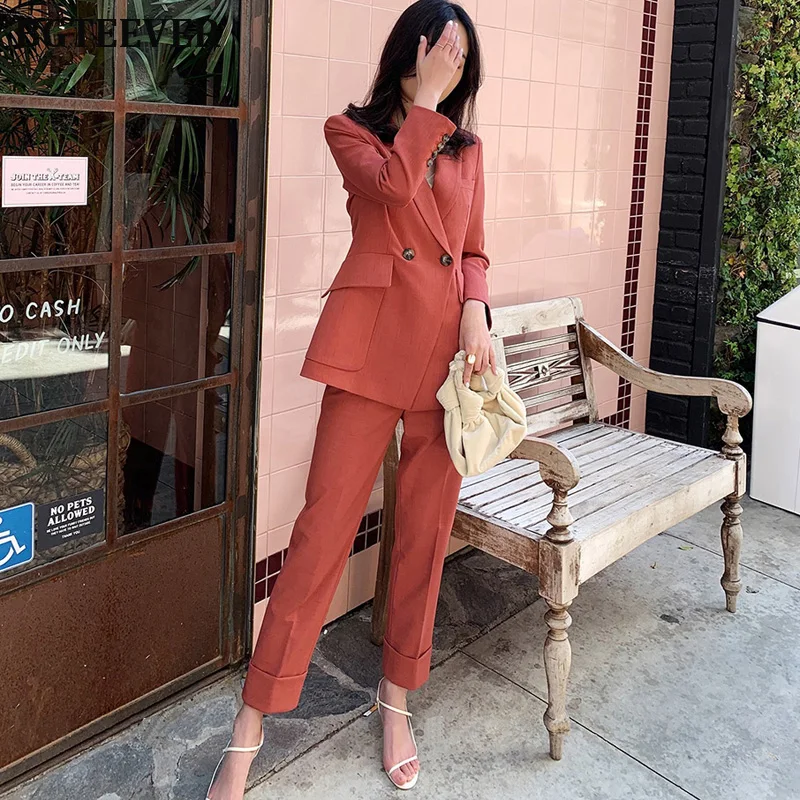 Женский брючный костюм, двубортный пиджак с английским воротником и брюки с высокой талией, офисный костюм, 2019
