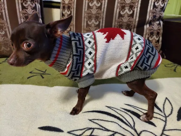 Кофта подошла на собаку чихуахуа ( весом примерно 4,5 кг) немножко плохо тянется.. но тёплая и наверное комфортная)