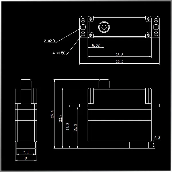 Характеристика:-- Высокая производительность, микро цифровой сервопривод крыла-- Высокоточные матальные шестерни (медь + титаниум)-- Высококачественный Бессердечный мотор-- Полностью CNC алюминиевые корпуса и структураУльтратонкая толщина-8 мм-- Двойные шариковые подшипникиСпецификация:Мертвый диапазон: 2 мксРабочая частота: 1520 мкс/330 ГцРабочее напряжение: DC3.5 ~ 8,4 вРабочая скорость (3,5 В):0.16 сек/60 градусовОперационной Скорость (5,0 V):0.10 сек/60 градусовОперационной Скорость (6,0 V):0.08sec/60 градусовРабочая скорость (7,4 В):0. 07сек/60 градусовРабочая скорость (8,4 в):0. 06сек/60 градусовКрутящий момент, крутящий момент (3,5 V): 2,0 kg. См (27,78 унций/дюйм)Крутящий момент, крутящий момент (5,0 V): 3,0 kg. См (41,67 унций/дюйм)Крутящий момент, крутящий момент (6,0 V): 4,0 kg. См (55,56 унций/дюйм)Крутящий момент, крутящий момент (7,4 V): 4,5 kg. См (62,50 унций/дюйм)Крутящий момент, крутящий момент (8,4 V): 5,0 kg. См (69,45 унций/дюйм)Размеры: 23,5x8x20 мм (0.92x0.31x0.78in)Вес: 8,6g (0,30 oz)Длина провода соединителя: 120 мм