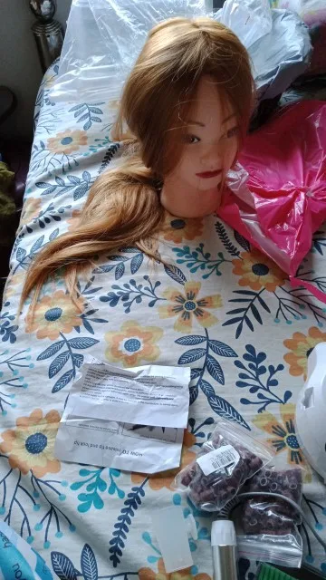 Спасибо за заказ! Я очень довольна. Продавец прислал фото манекена перед отправкой, лицо манекена вполне симпатичное. Волос много. Я взяла для тренировки кос. Но завивку попробую позже и добавлю фото. Заказ прибыл быстро. В комплекте штатив, расчёска, 1 зажим, петельки и резинки маленькие. Спасибо!
