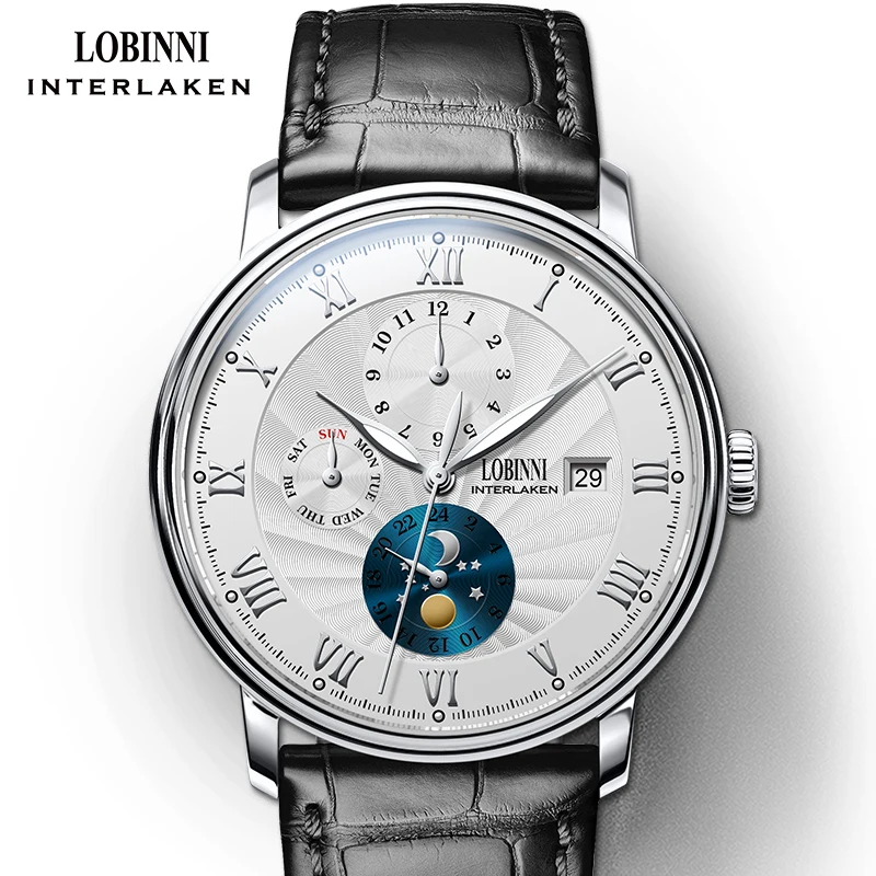 Швейцарские наручные часы LOBINNI, мужские часы Seagull, автоматические механические часы с сапфировым стеклом и фазой Луны, мужские часы