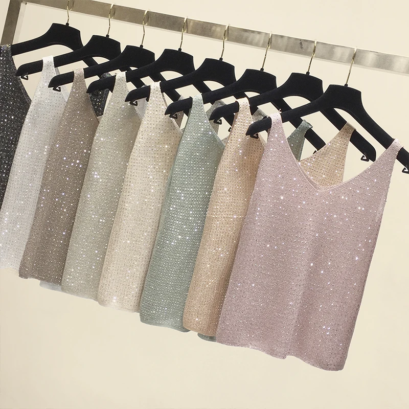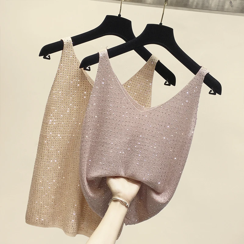 Майка женская черная, бежевая, зеленая, с V-образным вырезом, с бриллиантами, в европейском стиле, для лета, женский горный хрусталь