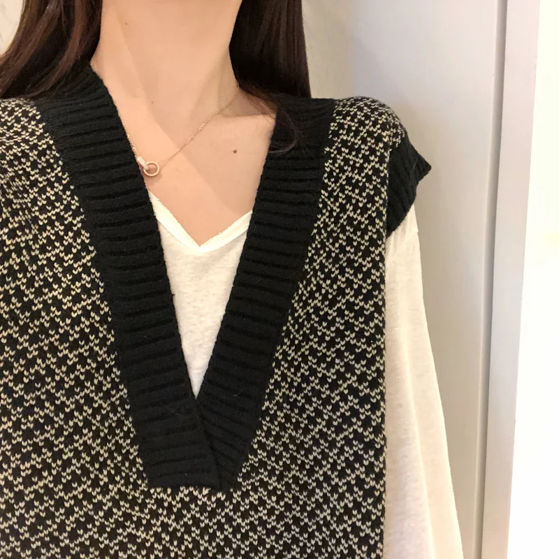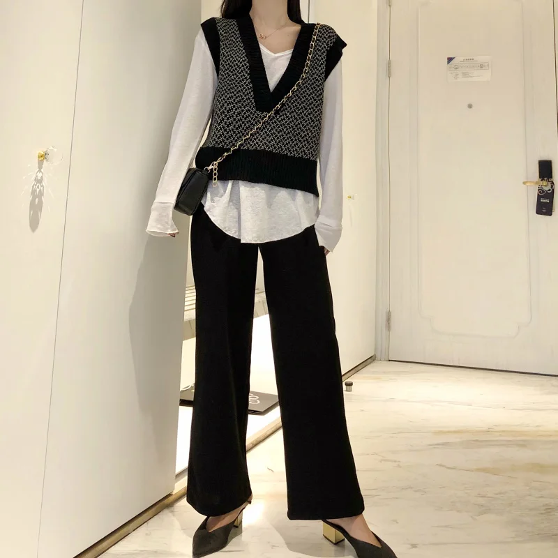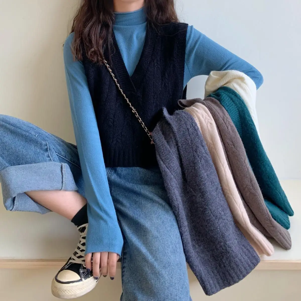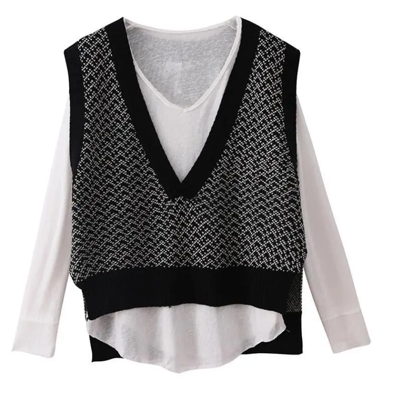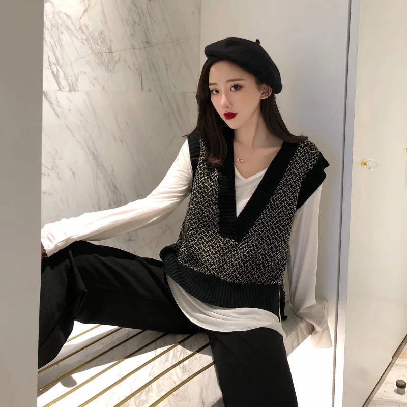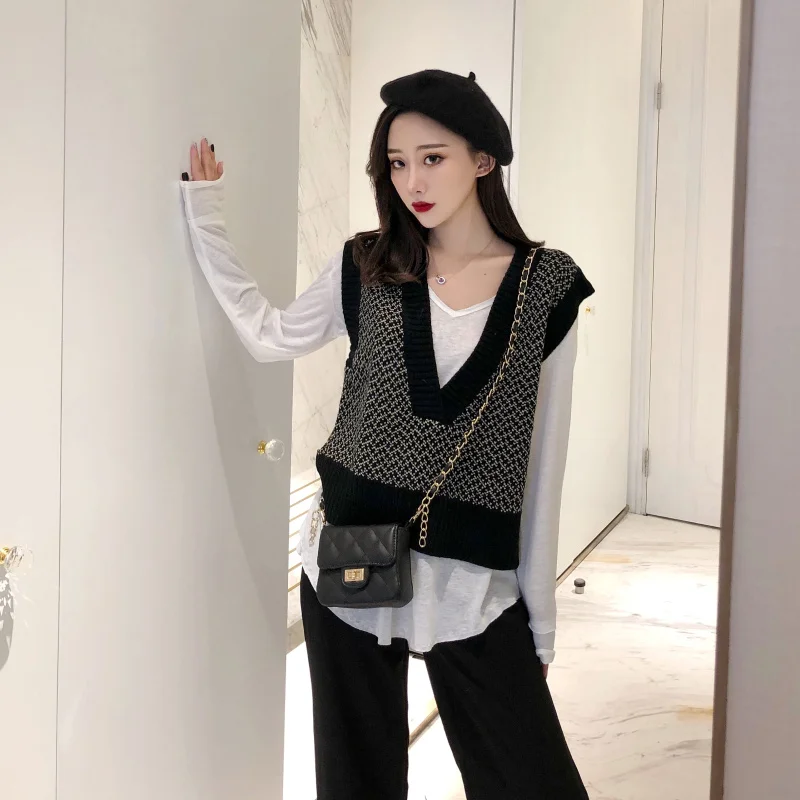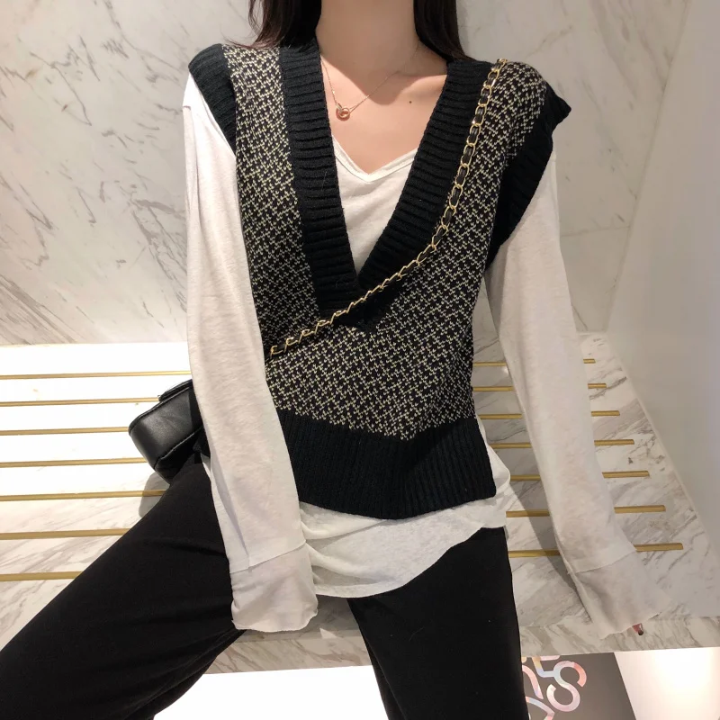 Женский вязаный свитер, жилет в Корейском стиле, винтажный Стильный пуловер без рукавов с V-образным вырезом в стиле пэчворк, топы на осень, T395, 2021