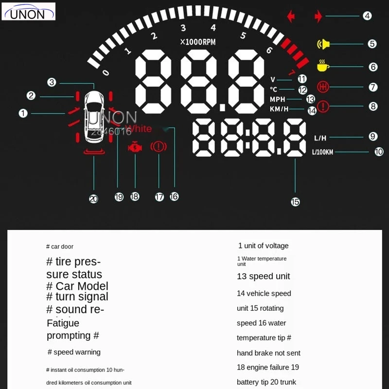 3. Возможность отображения огромного спектра автомобильной статистики, включая: скорость, скорость вращения двигателя, температуру воды, напряжение батареи, мгновенный расход топлива, средний расход топлива, местное время, время одной езды, измерение пробега, напоминание о смене, напоминание о усталости водителя, Сигнализация низкого напряжения, сигнализация о высокой температуре, сигнализация о скорости, оповещение о неисправности двигателя, Устранение кода неисправности, возможность изменения единиц измерения, например, километр/миля