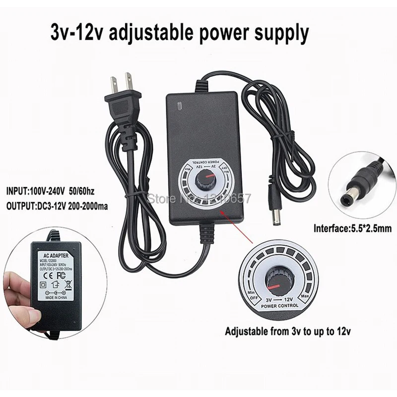 РегулируемыйРегулятор напряжения, постоянный ток 3-12 В 2 А, просто Отрегулируйте требуемое напряжение через ручку переключателя.