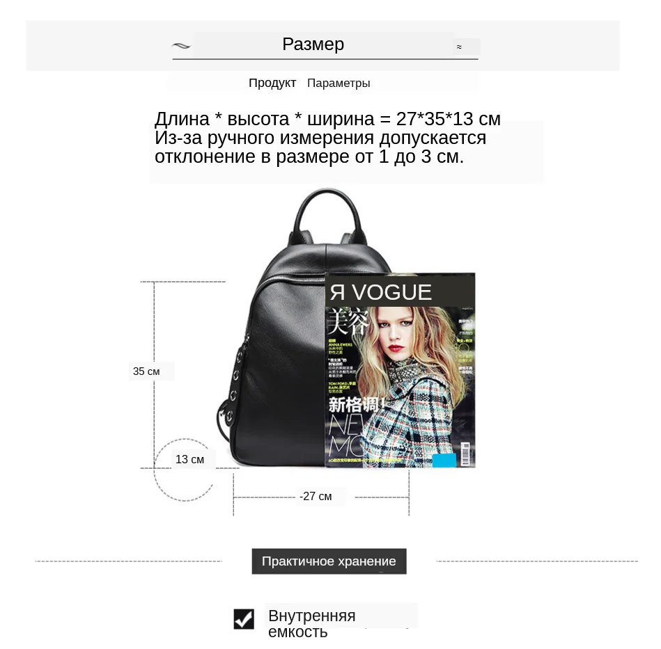 Не первый и далеко не последний заказ в магазине. Великолепный, вместительный и вместе с этим компактный стильный кожаный рюкзак. Ключевым для меня было наличие массы карманов, как внешних, так и внутренних, бумаги форма А4 полностью не помещаются, как и 13 дюймовый ноут. Продавца и товар рекомендую.
