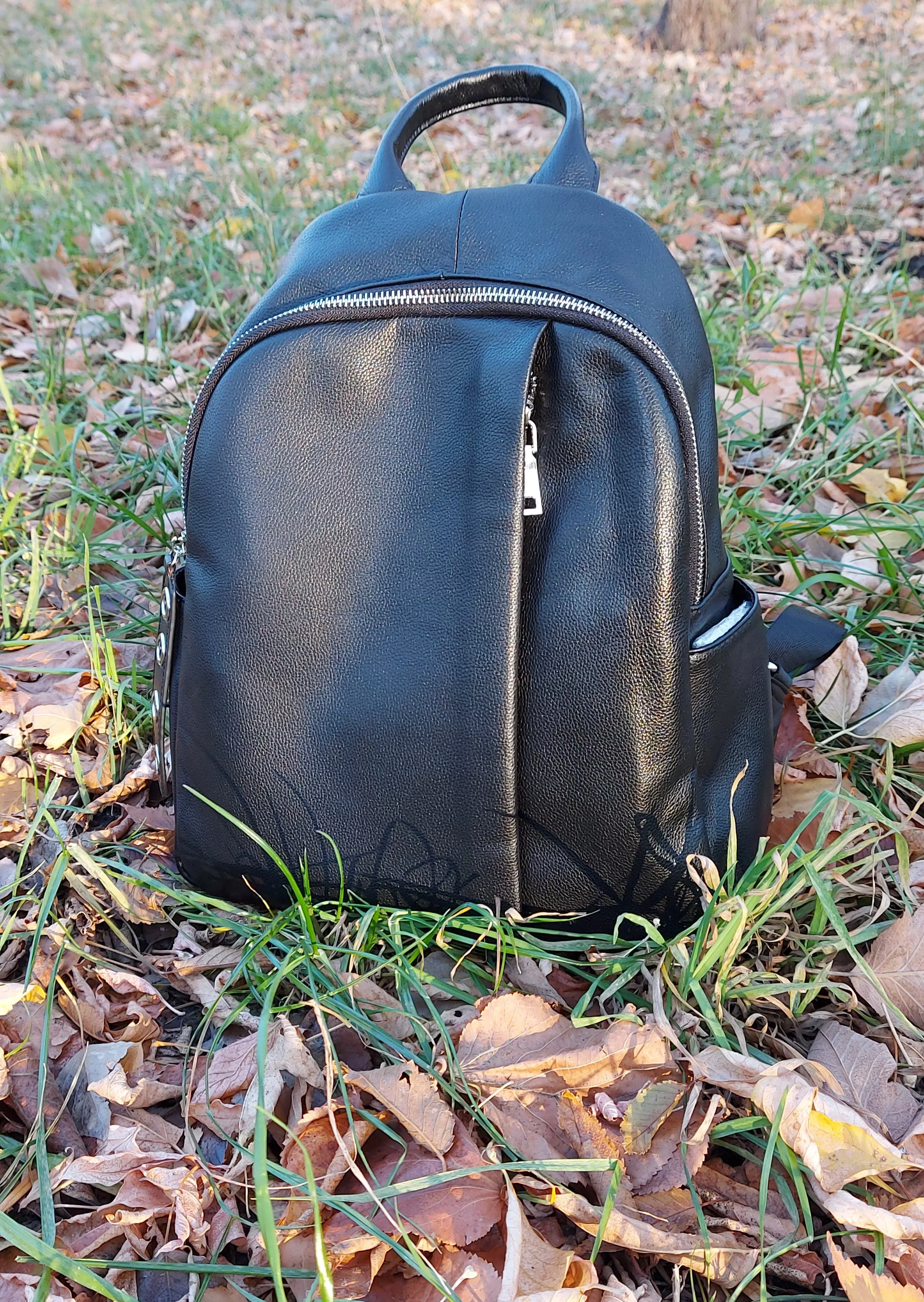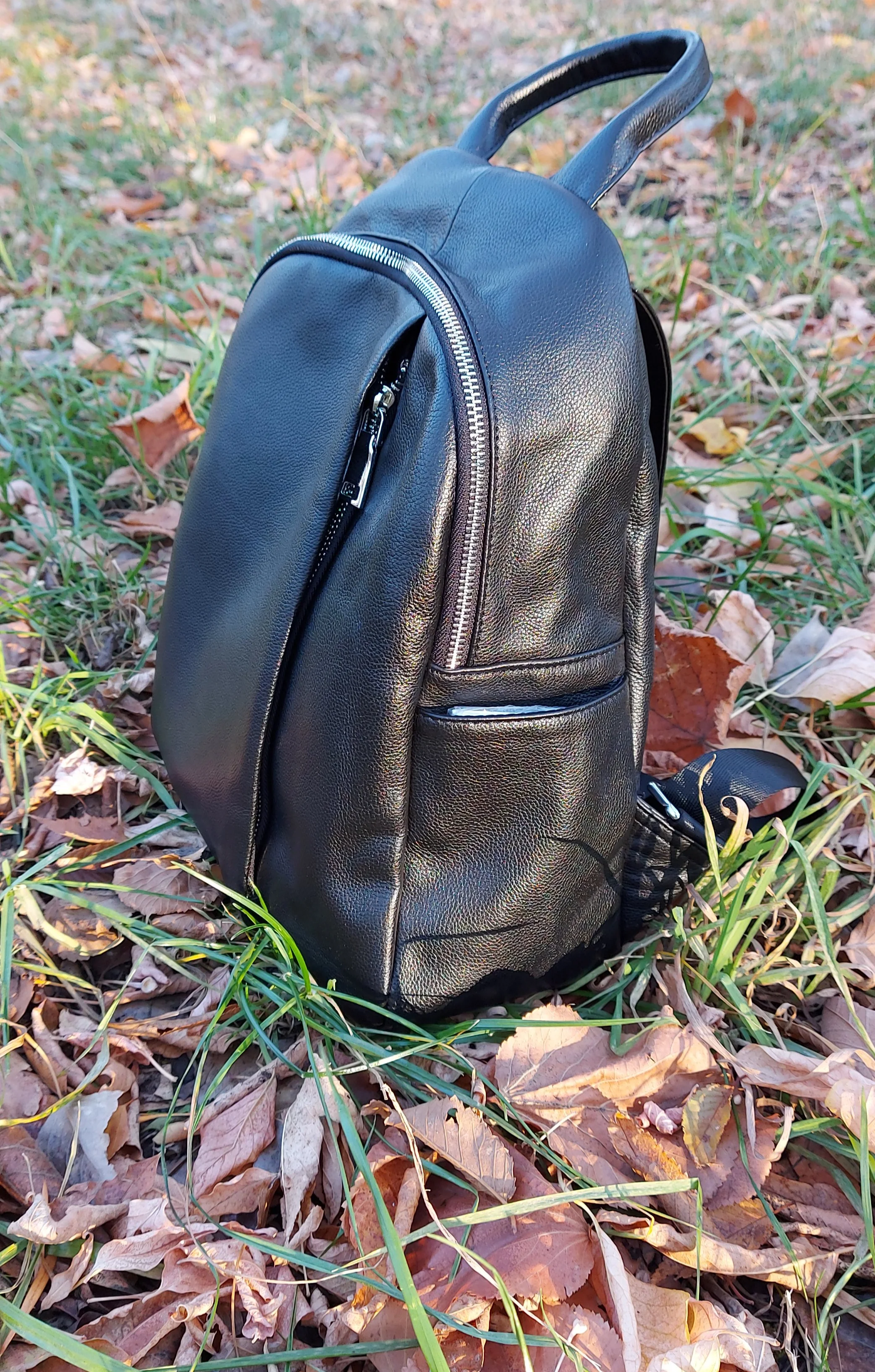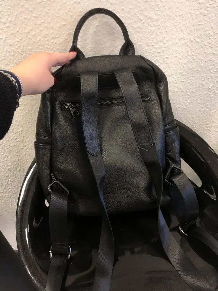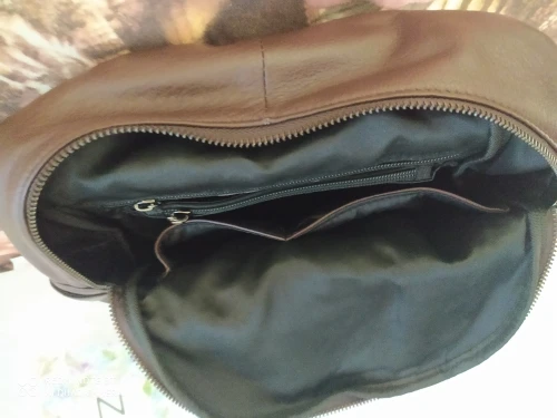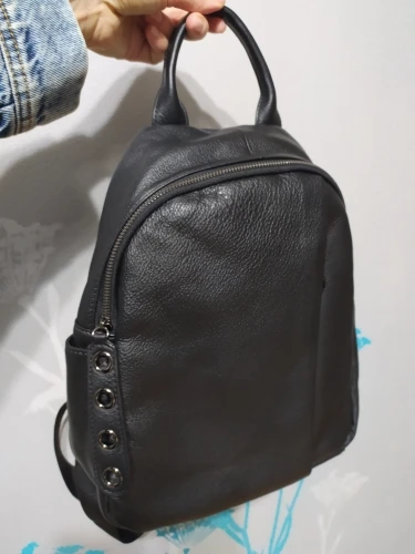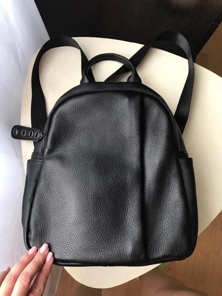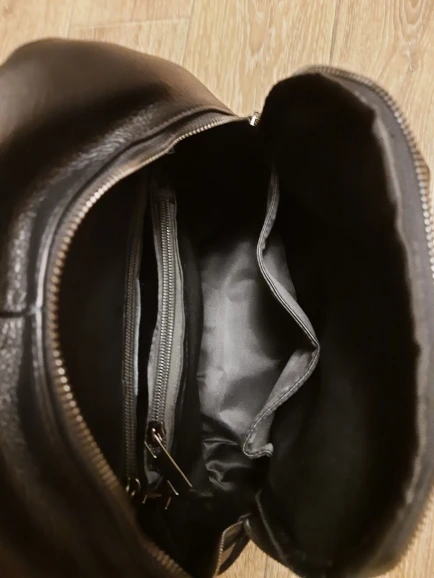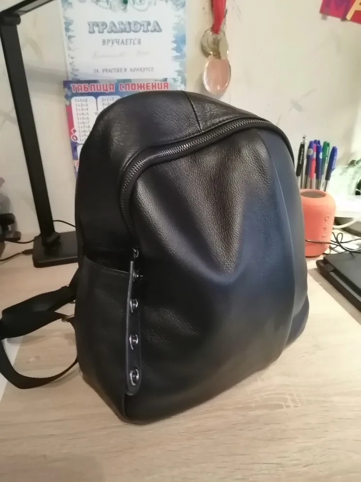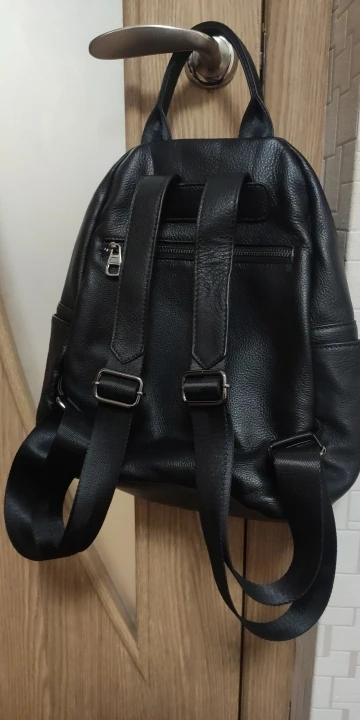 Рюкзак качественный, сшит хорошо, фурнитура норм, внутри большое отделение, карманы для телефона, ключей и три кармана для мелочей, документов, два из них на замочках, снаружи два кармана. Подкладка хорошая, не жидкая. Запакован был хорошо, куча бирочек, ручки в обмотке, образец кожи. Кожа спереди нормальная, по бокам и сзади крупнопористая, может свиная? На ощупь мягкая, приятная. Запах был, краски и кожи, немного резкий, день погуляла- выветрился. Пришло все вовремя. В целом давольна. Спасибо.