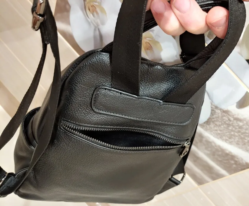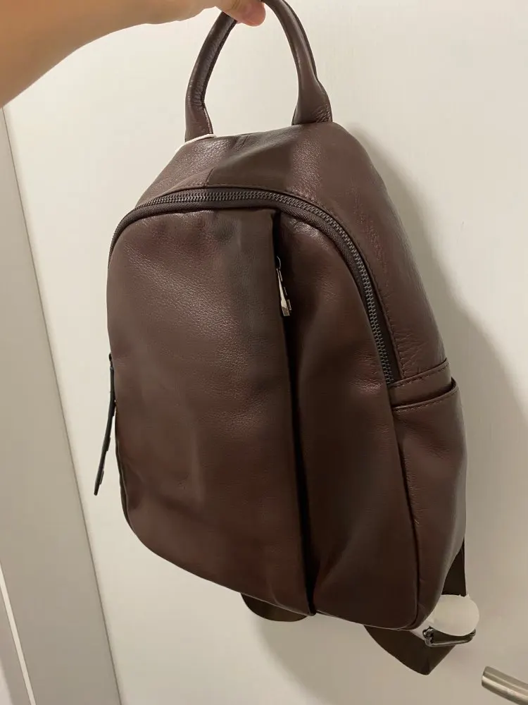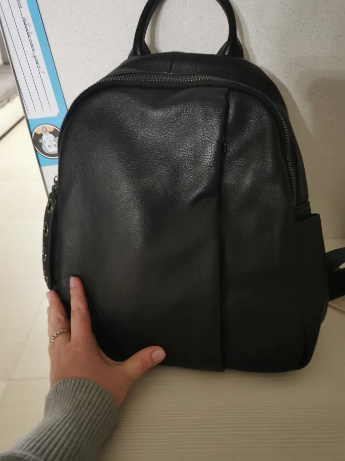 Рюкзак классный. Мягкий, вместительный, кармашки все удобные. Наверное, кожаный. Думала, что будут напрягать тканевые ручки, а оказалось даже лучше кожаных, мягко свисают, не топорщатся, не удешевляют. Выглядит прилично, не дёшево. Пришёл очень быстро, в Иваново за 2 недели. Довольна.