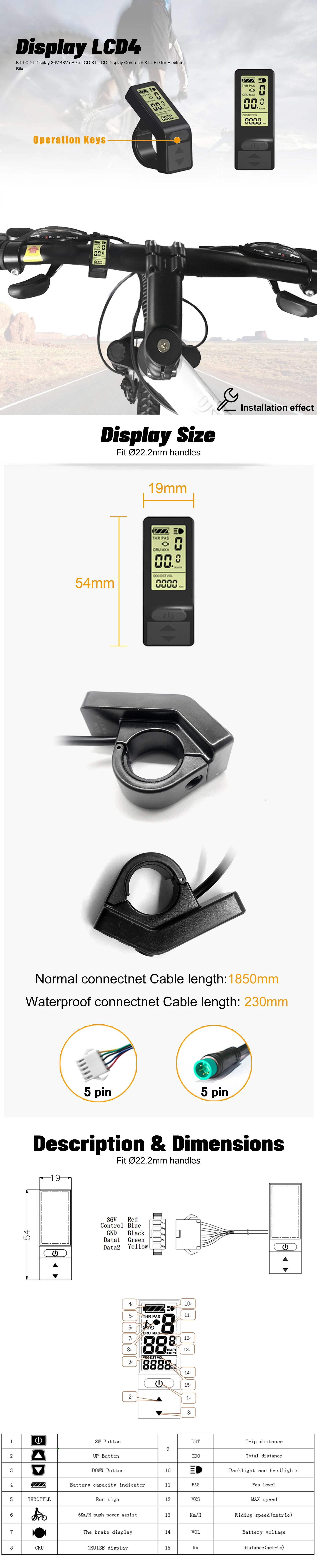 1. Вы должны быть уверены, что ваш контроллер KT. Потому что этот дисплей Kunteng LCD4 просто совместим с контроллером Kunteng. Они имеют тот же протокол связи.2. 24V 36V 48V WP Длина кабеля около 21 см, не может подключиться к блоку управления напрямую. Нужен 1to4 автобус-кабель.