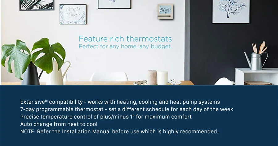 * Широкая совместимость-работает с системами отопления, охлаждения и теплового насоса * 7-программный подогревающий термостат-установить другую расписание на каждый день недели * Точный контроль температуры Плюс/минус 1 ° для максимального комфорта, * Автоматическое изменение от тепла до охлаждения Примечание: ознакомьтесь с руководством по установке перед использованием, которое настоятельно рекомендуется.