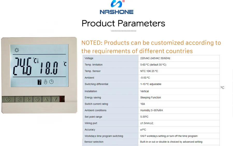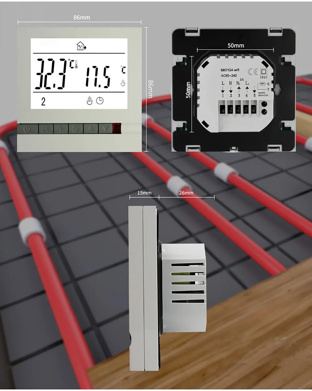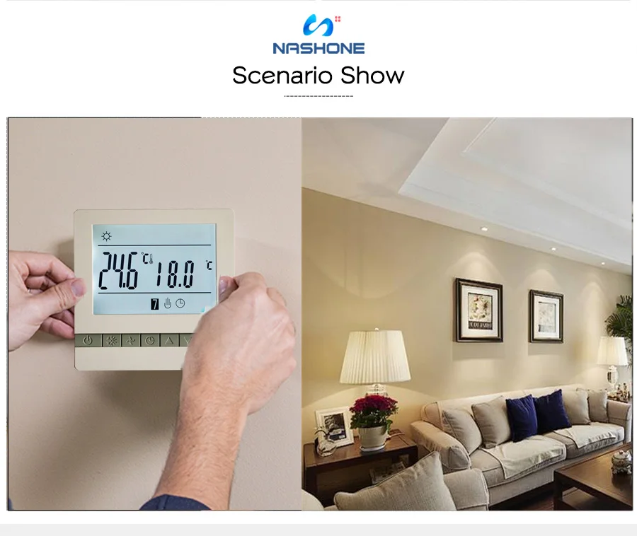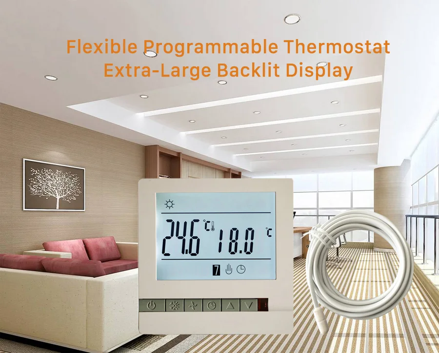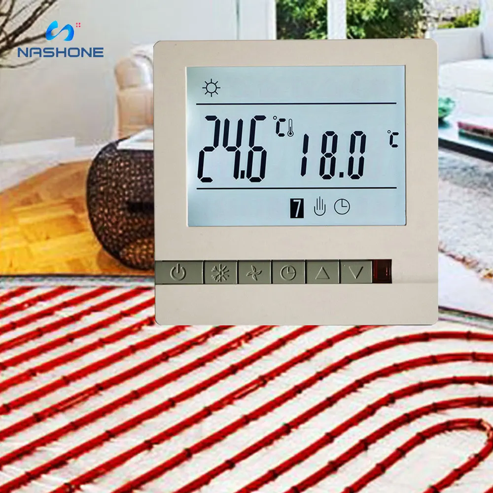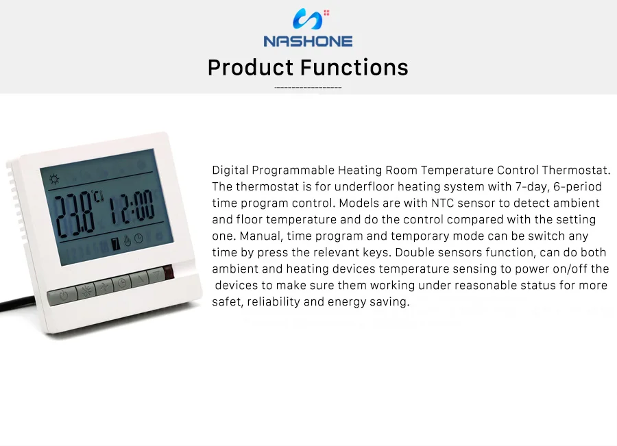Цифровой Программируемый Термостат контроля температуры в помещении. Термостат для система напольного отопления с 7-дневный, 6-период времени с программным управлением. Модели оснащены датчиком NTC для обнаружения температуры окружающей среды и пола и контроля по сравнению с настройкой. Руководство, программа времени и временный режим можно переключать в любое время нажатием соответствующих клавиш. Функция двойных датчиков, может сделать как окружающие, так и нагревательные устройства с датчиком температуры для включения/выключения устройств, чтобы убедиться, что они работают под разумным статусом для большей безопасности, надежности и экономии энергии.