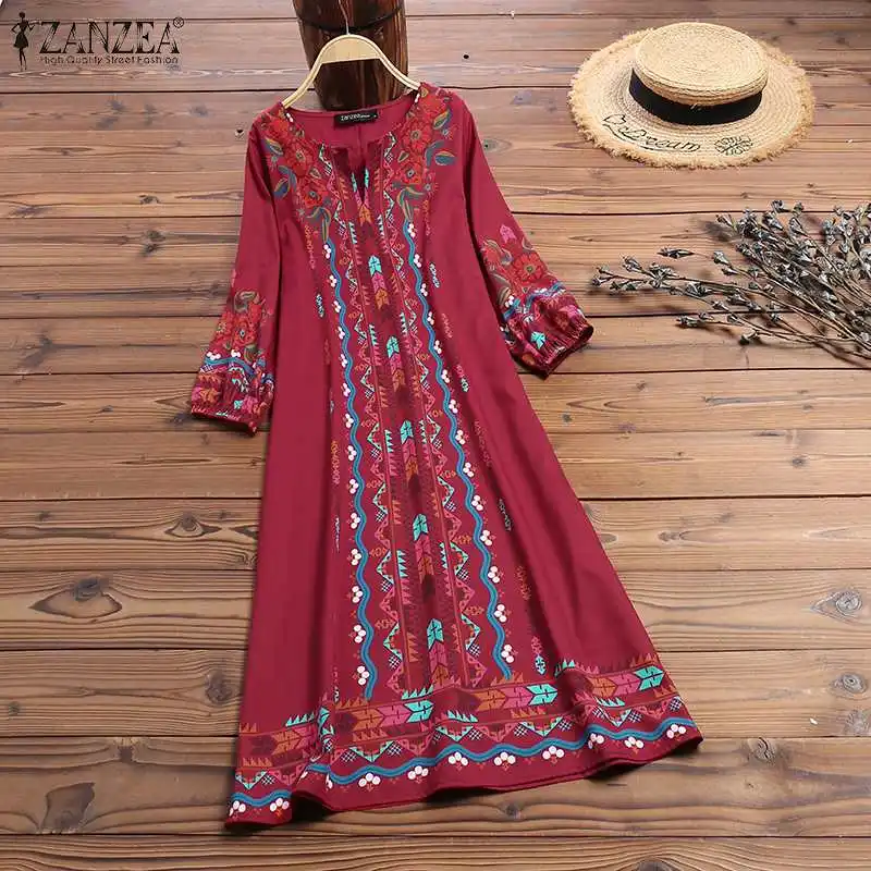 Платье ZANZEA женское с цветочным принтом, винтажный пляжный сарафан с V-образным вырезом и рукавом 34, с разрезом на подоле, в богемном стиле, осень 7