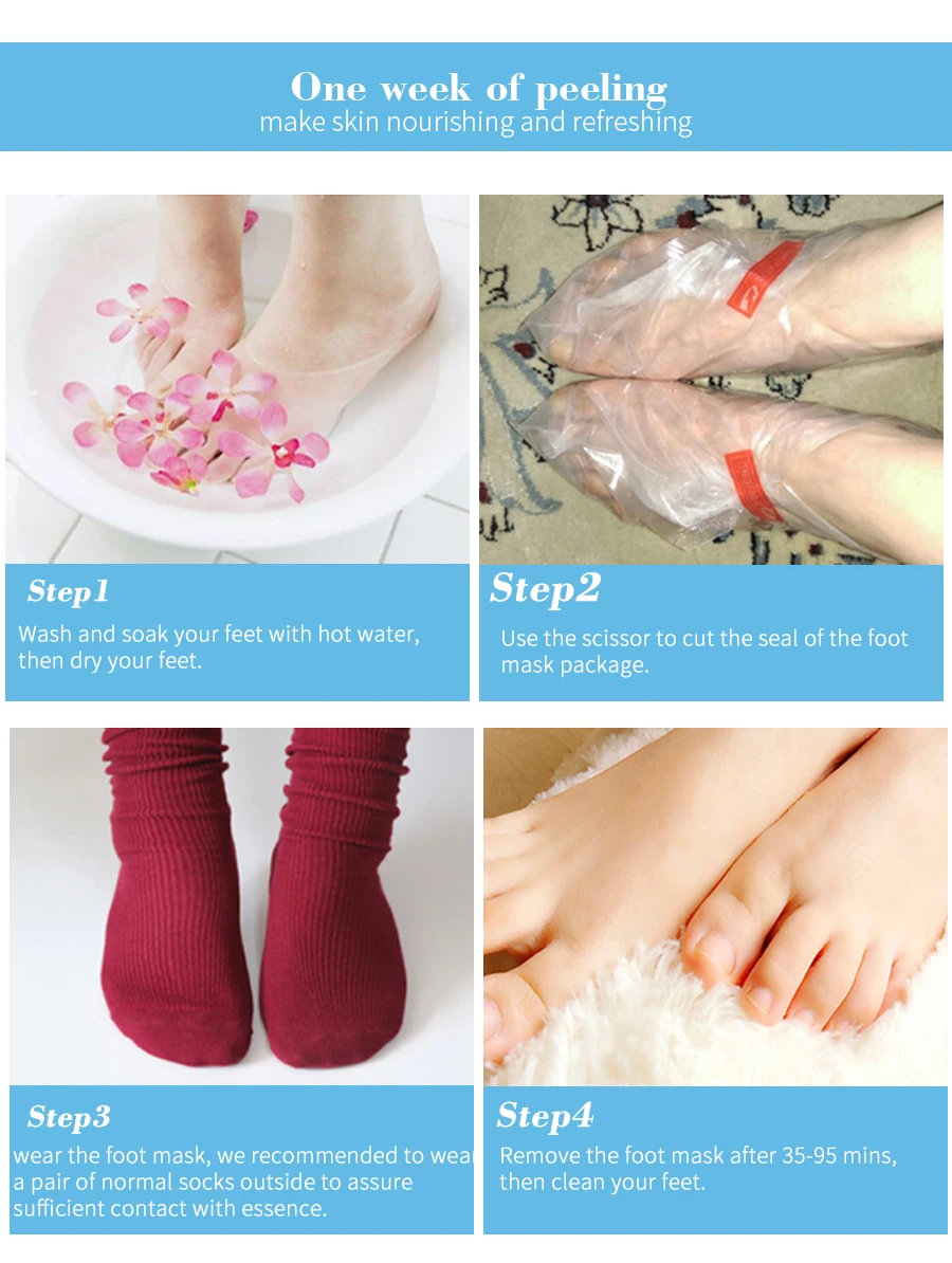 Руководство пользователя-правильная инструкция очень важна, повлияет на эффект маски для ног. 1. вымойте ноги, замочив их в горячей воде, затем высушите ноги. 2. используя ножницы, откройте пакет с маской для ног. 3. наденьте маску для ног (мы рекомендуем надеть пару обычных носков сверху, чтобы обеспечить достаточный контакт со средством). 4. через 35-95 минут снимите маску для ног, очистите ноги. 5. Большинство людей начинает очищать омертвевшую кожу после 48 часов использования, но из-за различного типа кожи, кому-то может потребоваться использовать 2-3 пары, пожалуйста, используйте маску для ног снова через 48 часов. 6. не используйте маску, если у вас есть незалеченные порезы или раны. 7. рекомендуем замочить ноги в горячей воде через 48 часов после использования.