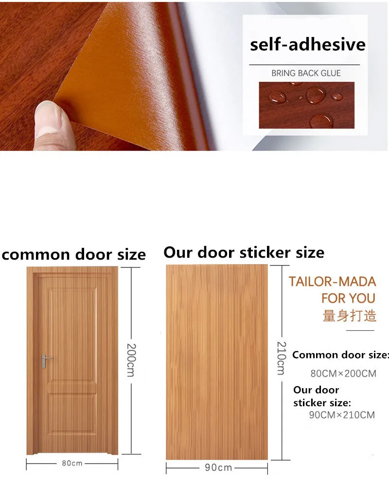 Product Name: Wood Grain Door Sticker Waterproof Adhesive Wallpaper Wooden Door Renovation Cabinet Furniture Home Decor DIY Wall Mural Decals 1. Material: Environment-friendly Waterproof PVC 2. Product Size: Wood grain door sticker :90cm x 2.1m Door frame sticker:30cm x 5m