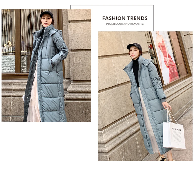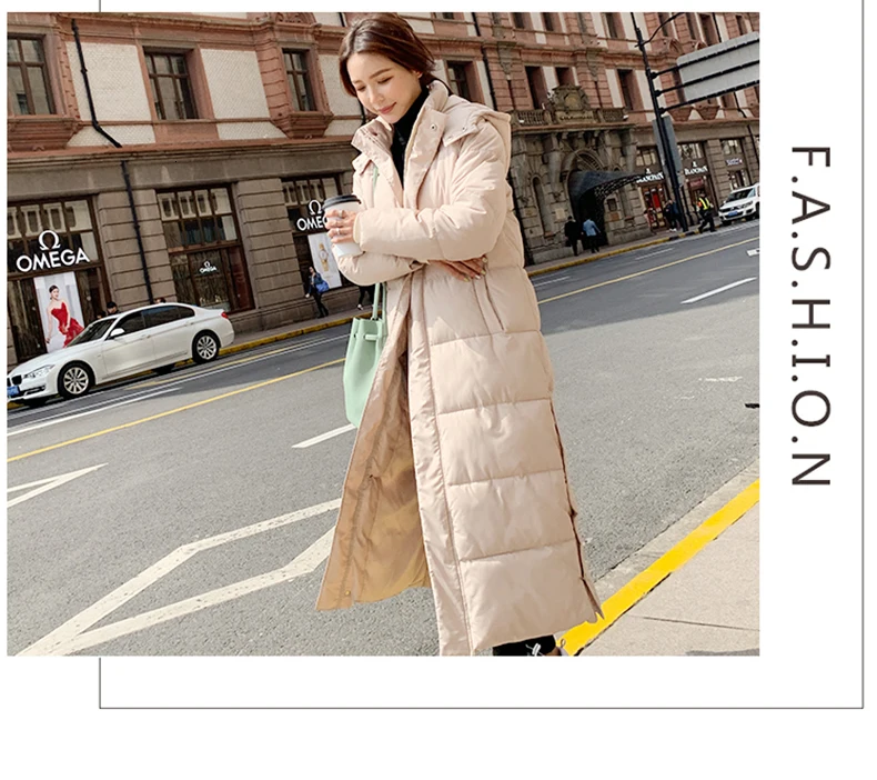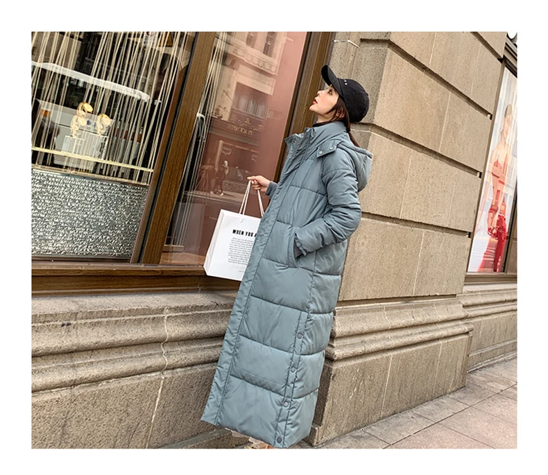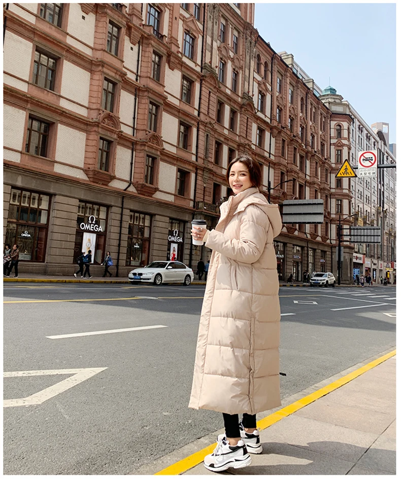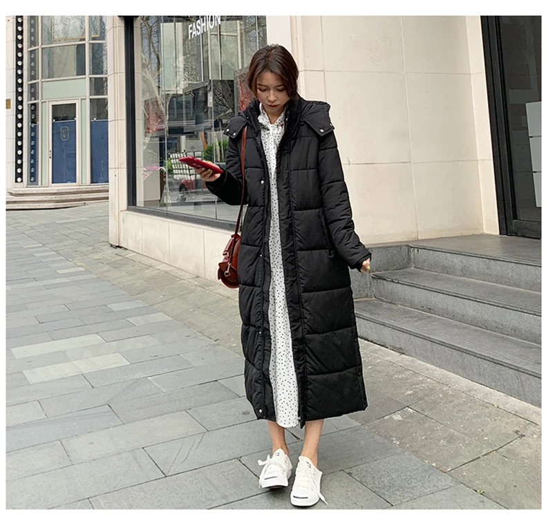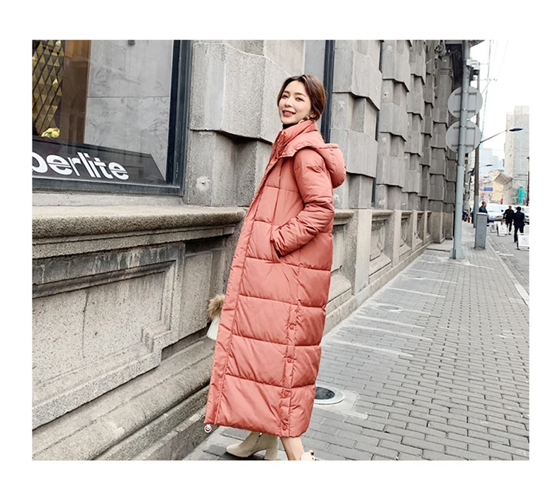 Женское длинное зимнее пуховое пальто с капюшоном, Толстая теплая куртка с хлопковой подкладкой, стеганые парки с большими карманами