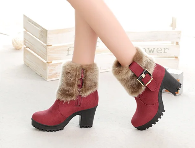 Женские ботинки на квадратном каблуке, зимние классические ботинки с пряжкой, теплые меховые ботинки, Черные ботильоны на платформе, 2019