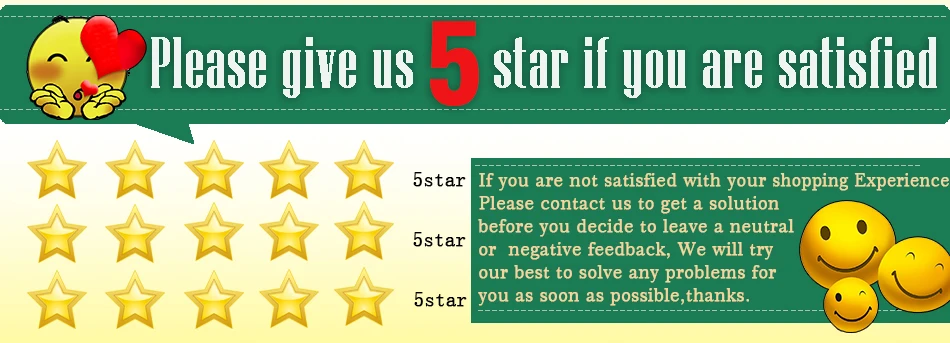 2. Если вы не удовлетворены своим опытом покупок, пожалуйста, свяжитесь с нами, чтобы получить решение, прежде чем вы решите оставить нейтральный или отрицательный отзывы, мы постараемся сделать все возможное, чтобы решить любые проблемы для вас как можно скорее, спасибо.