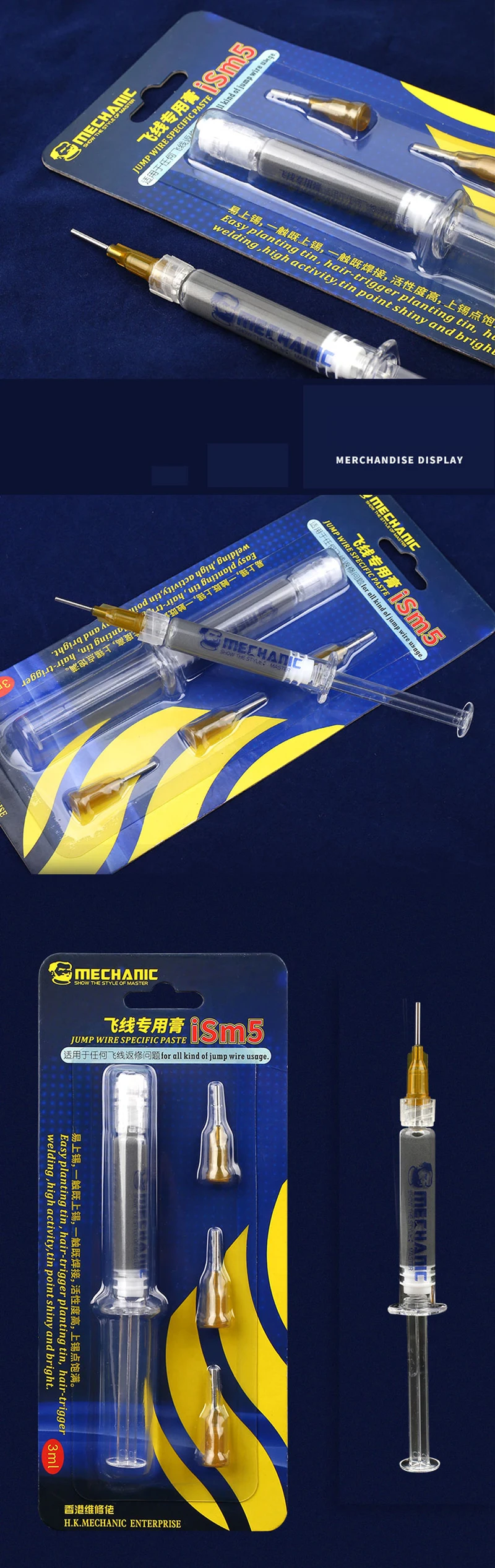 Speification: -Mechanic iSm5 специальная паста с 3 иглами -Объем: 3 мл -- Температура: 183-210 ℃ -- Легко жестяная, высокая активность, летающая линия на ощупь, Оловянная точка полная -- Проблема переработы для любого скакающего провода Что в посылка: -- 1 * iSm5 специальная паяльная паста