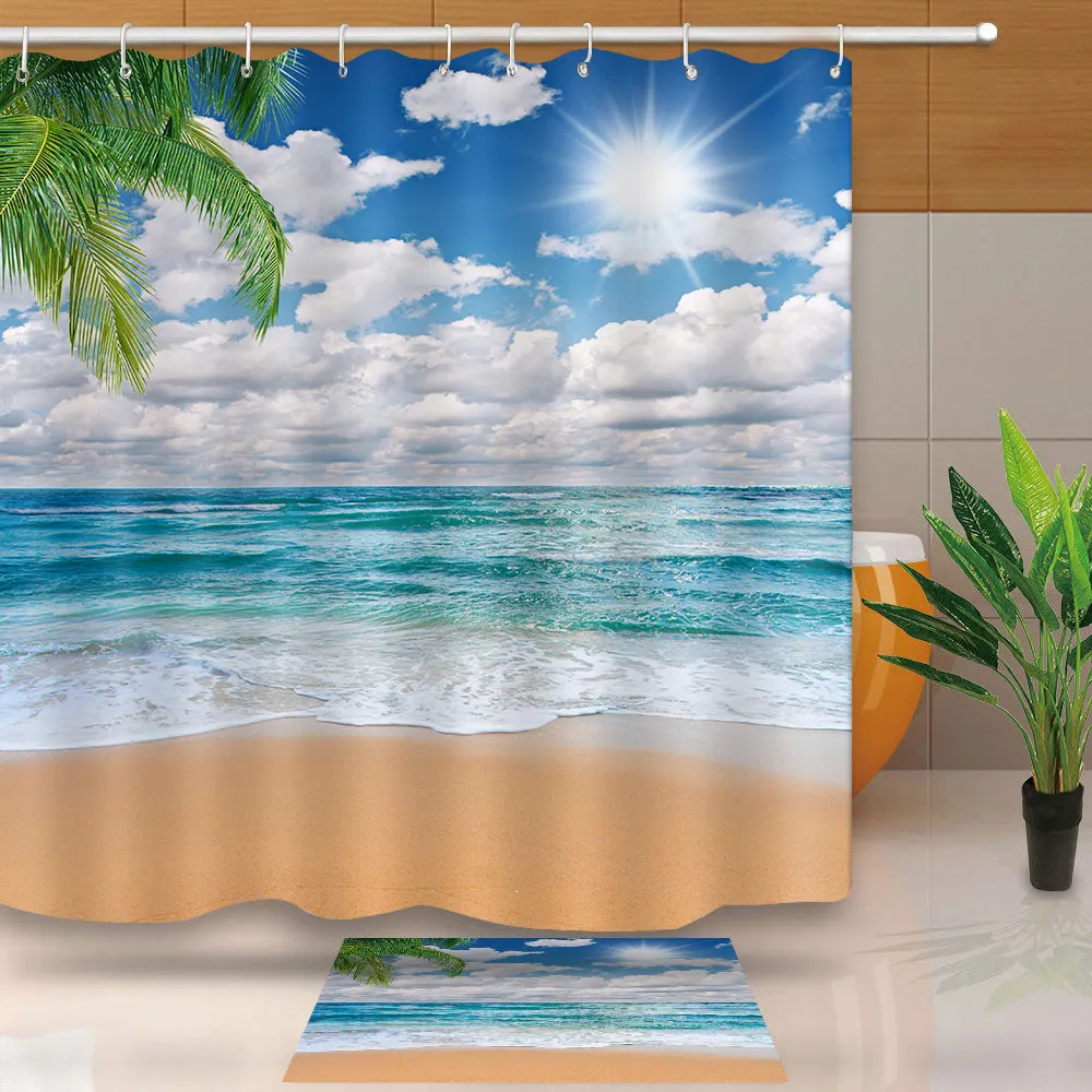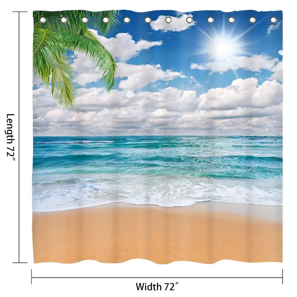 Занавески для душа MTMETY, из полиэстера, водонепроницаемые, с кокосовой пальмой, с изображением морского берега, с крючками