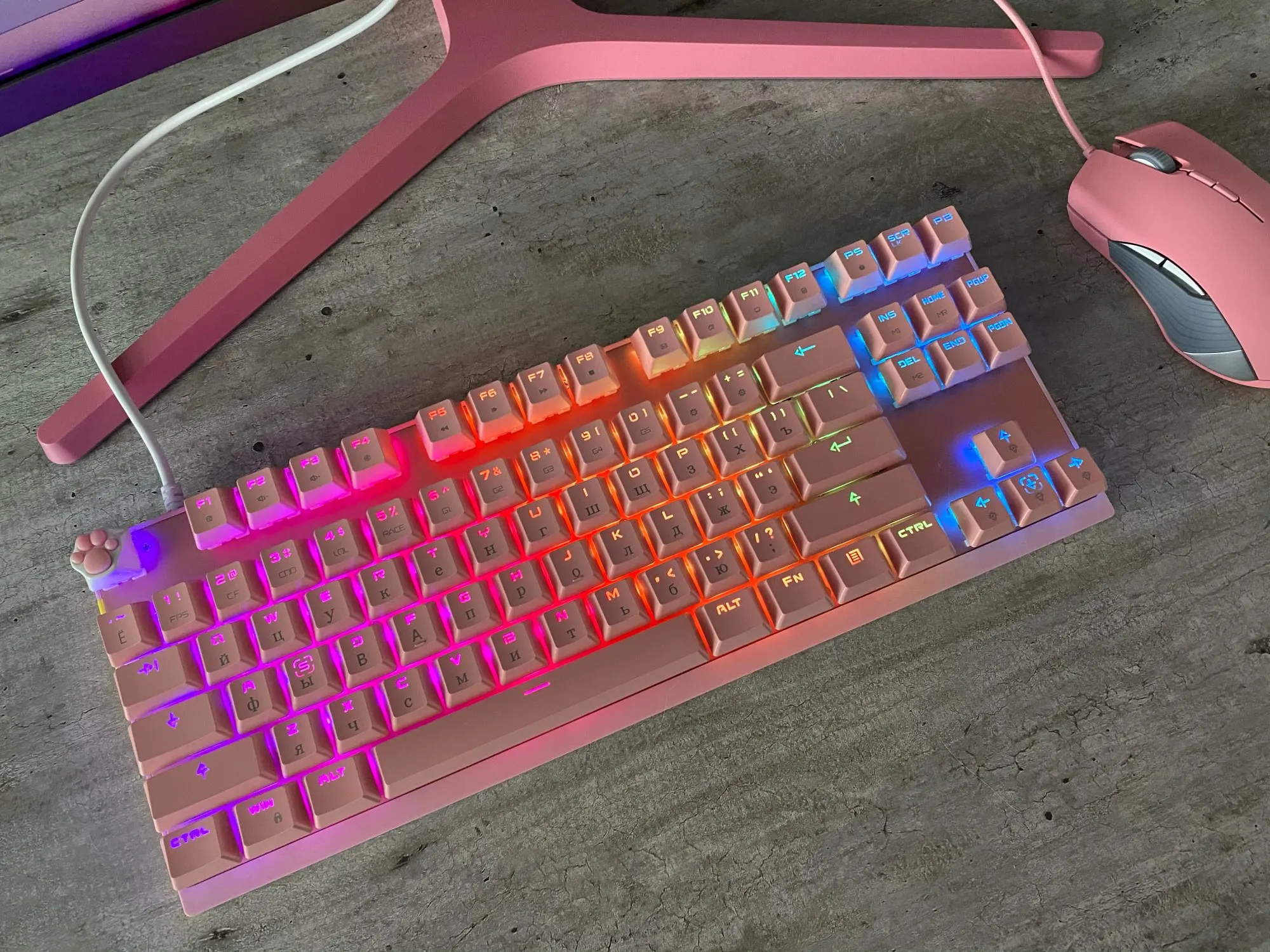 Отличная и компактная клавиатура за свои деньги. Поначалу непривычно из-за отсутствия цифровой панели справа, но это только первое время. Клавиатура имеет множество вариаций подсветки и регулировку яркости свечения, разобраться со всем этим можно с помощь инструкции в коробке. Так же с ней в комплекте идёт Keycap Puller, но снять клавиши без его помощи так же не составит большого труда. Приятный звук при нажатии по клавишам. На обратной стороне имеются подставки, что тоже очень удобно. Ускоренная доставка заняла 14 дней.