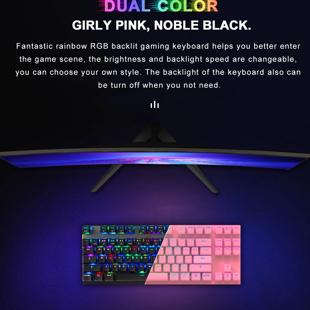 очень красивая клавиатура, брала с синими - громкий приятный звук (как и хотелось), разные прикольные подсветки, удобно и печатать и играть, выше ожиданий))) доставка 12 дней!) хорошо упаковано)