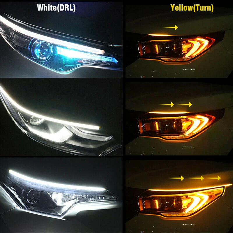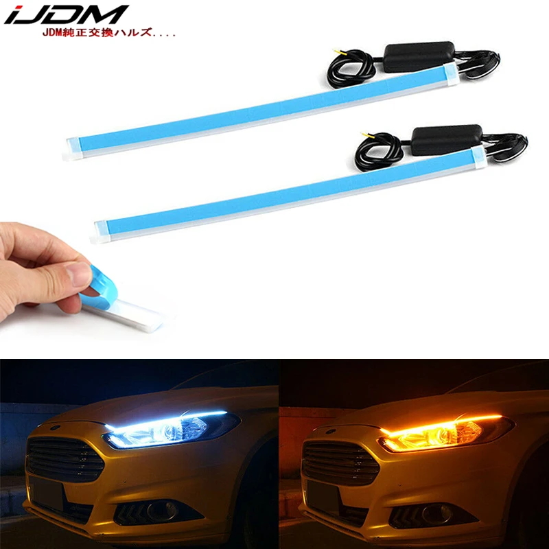 Включает (2) 30 см/45 см/60 см длинные водостойкие светящиеся Двухцветные светодиодные ленты с двусторонней лентой на задней панели и 36 "длинный жгут проводов Осветите Ксеноновые белые, как дневные ходовые огни DRL и динамическая последовательная Янтарная вспышка для дополнительного сигнала поворота Водонепроницаемая конструкция позволяет легко приклеивать светодиодную ленту снаружи головного света (либо выше, либо ниже), не открывая корпус фары Идеальное украшение фар для автомобилей грузовиков и внедорожников, чтобы дать более уникальный и современный вид с улучшенным стилем в ночное время!