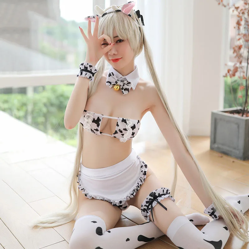 Женский комплект японского аниме молоко, Корова, соблазнительный костюм для косплея, милое нижнее белье, бюстгальтер и колготки чулки, комплект бикини с фартуком
