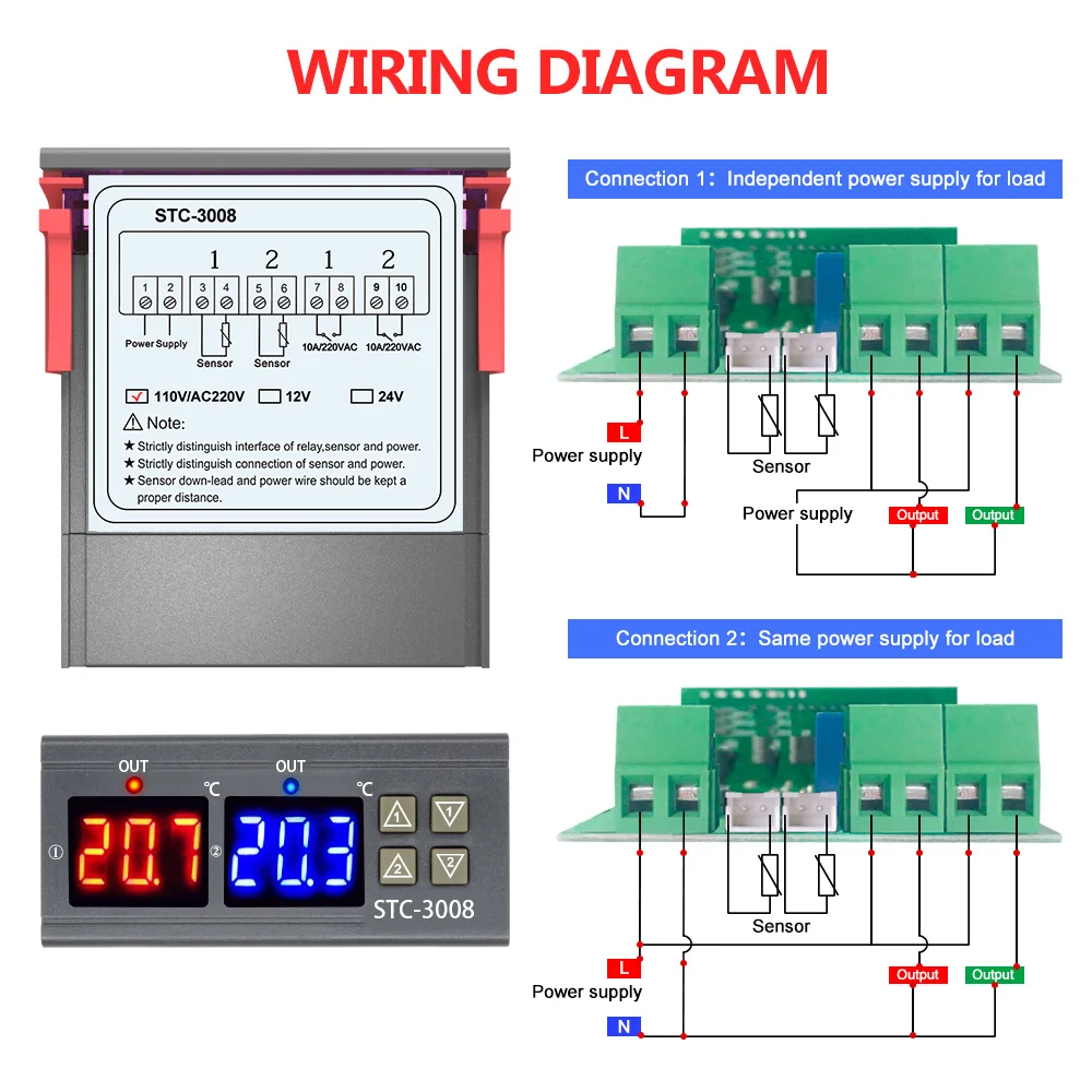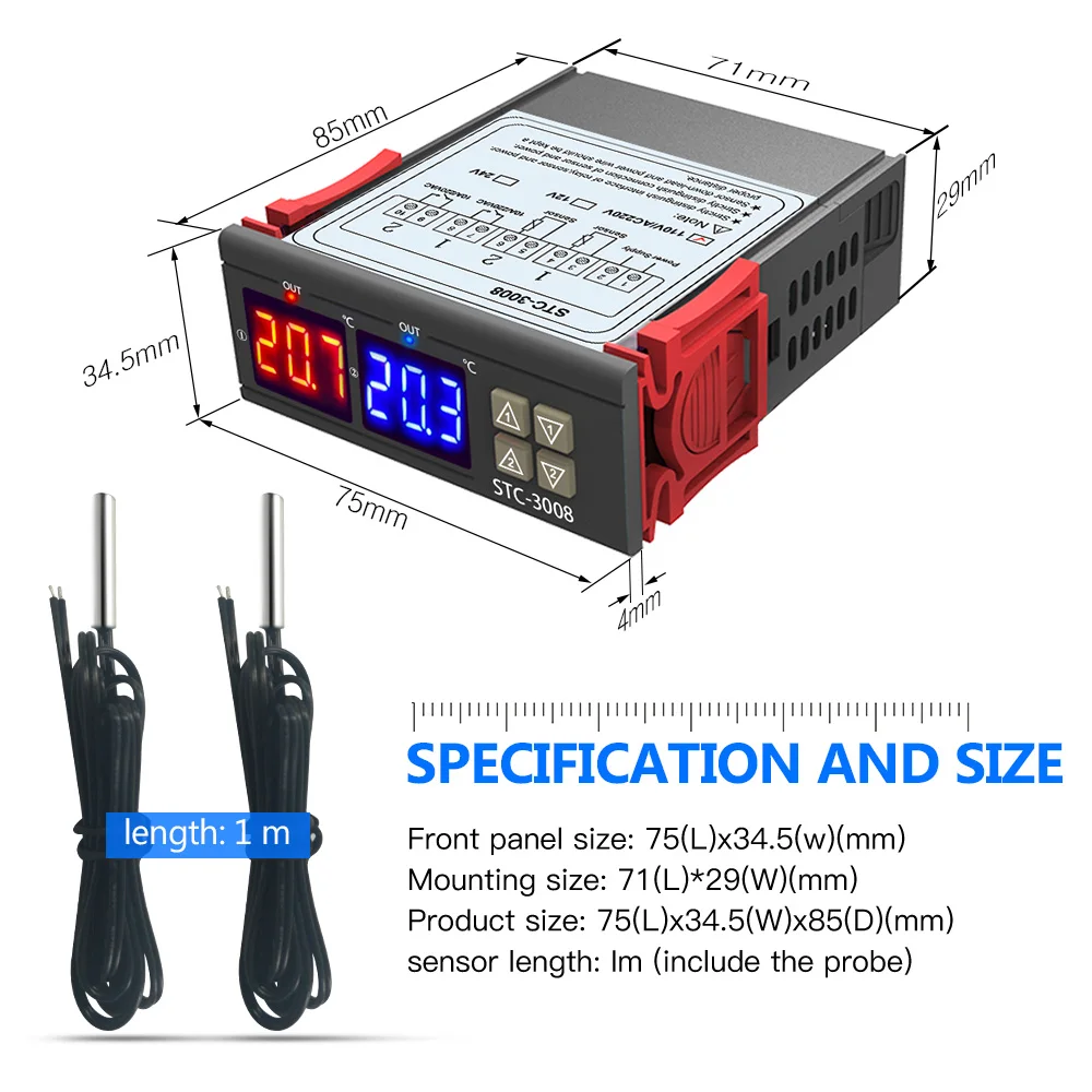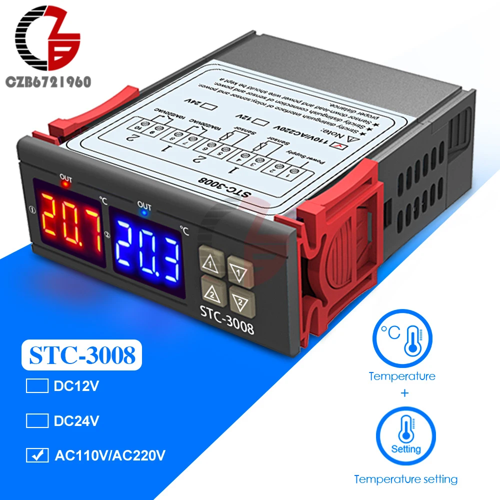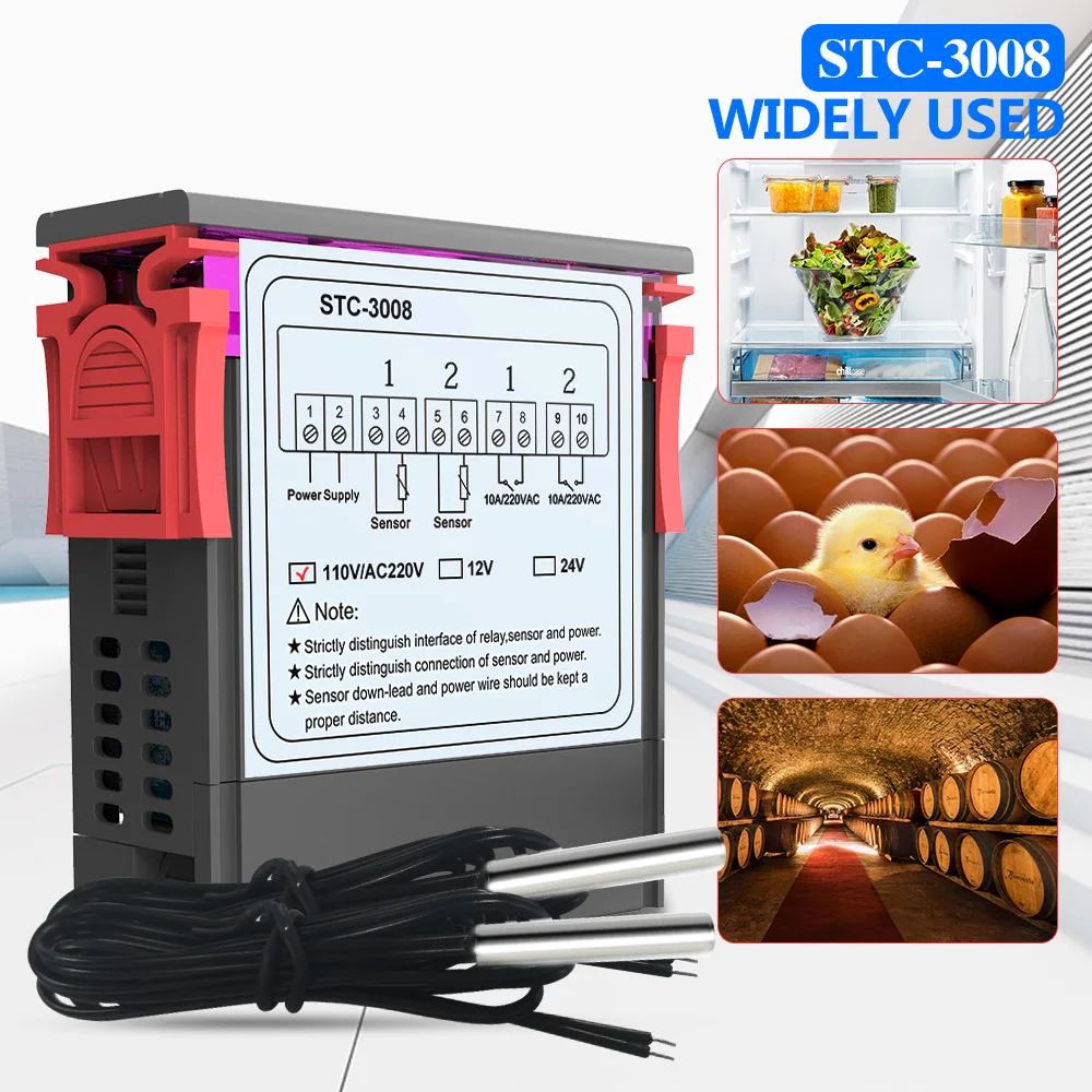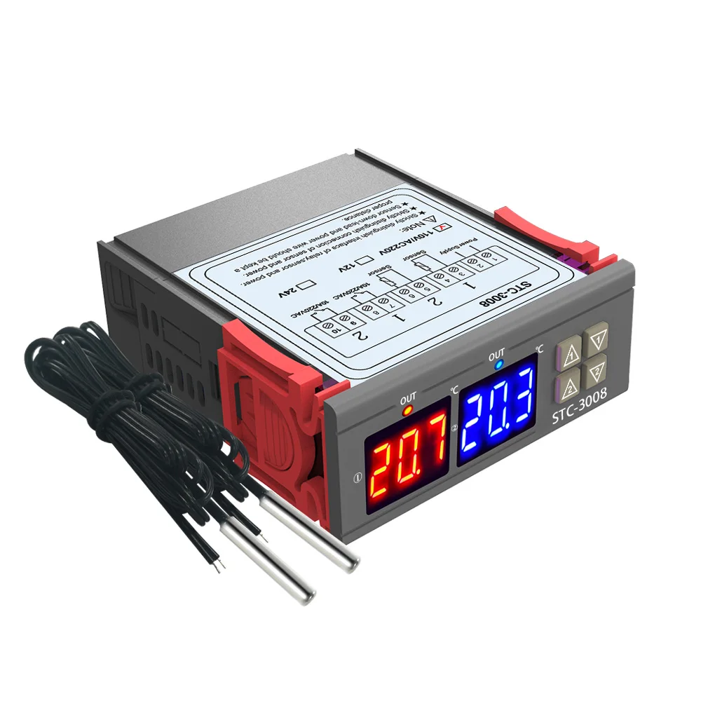 Цифровой термостат STC-3008, двойной светодиодный датчик для контроля температуры, 110 В переменного тока, 220 В, для нагреванияохлаждения холодильника