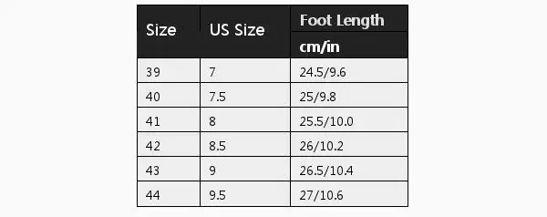 Таблица размеровРазмер::39Размер США::7Длина стопы (см/дюйм)::24,5/9,6Размер::40Размер США::7,5Длина стопы (см/дюйм)::1/25/9Размер::41Размер США::8Длина стопы (см/дюйм)::25,5/10Размер::42Размер США::8,5Длина стопы (см/дюйм)::1/26/10Размер::43Размер США::9Длина стопы (см/дюйм)::26,5/10,4Размер::44Размер США::9,5Длина стопы (см/дюйм)::1/27/10