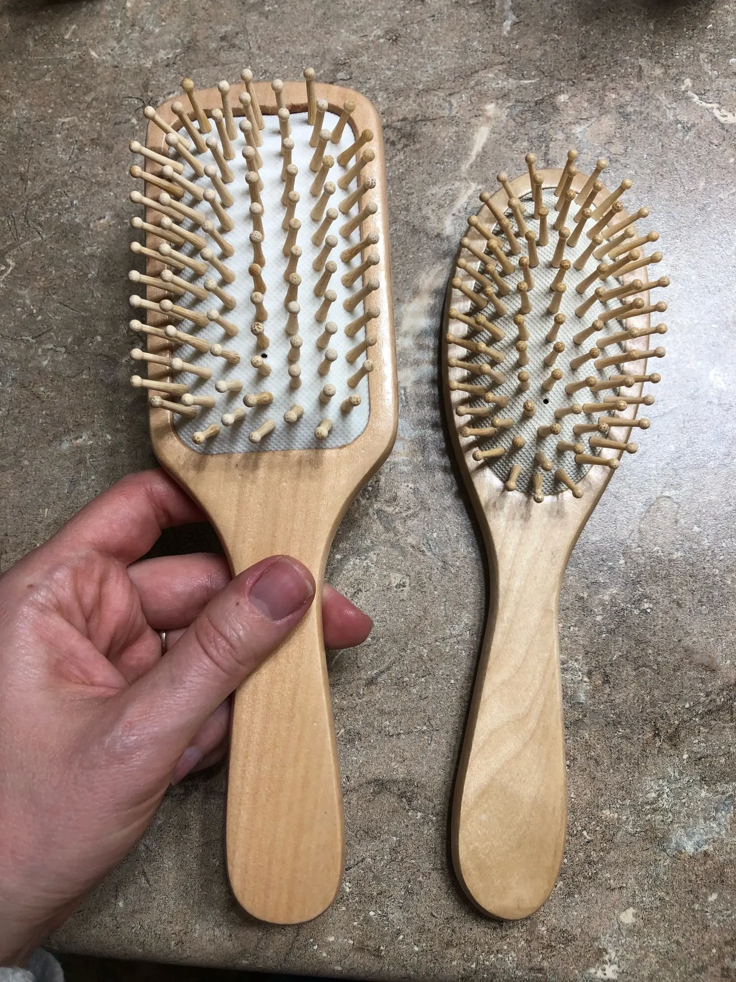 Расческа дерево. Выпал только один зуб при транспортировки. За это звезду сняла.Товар как на фото.