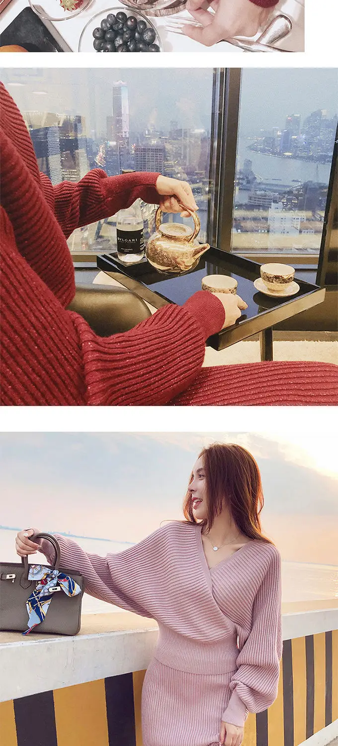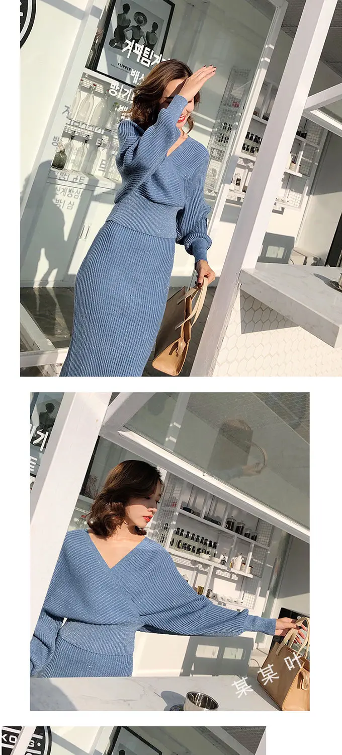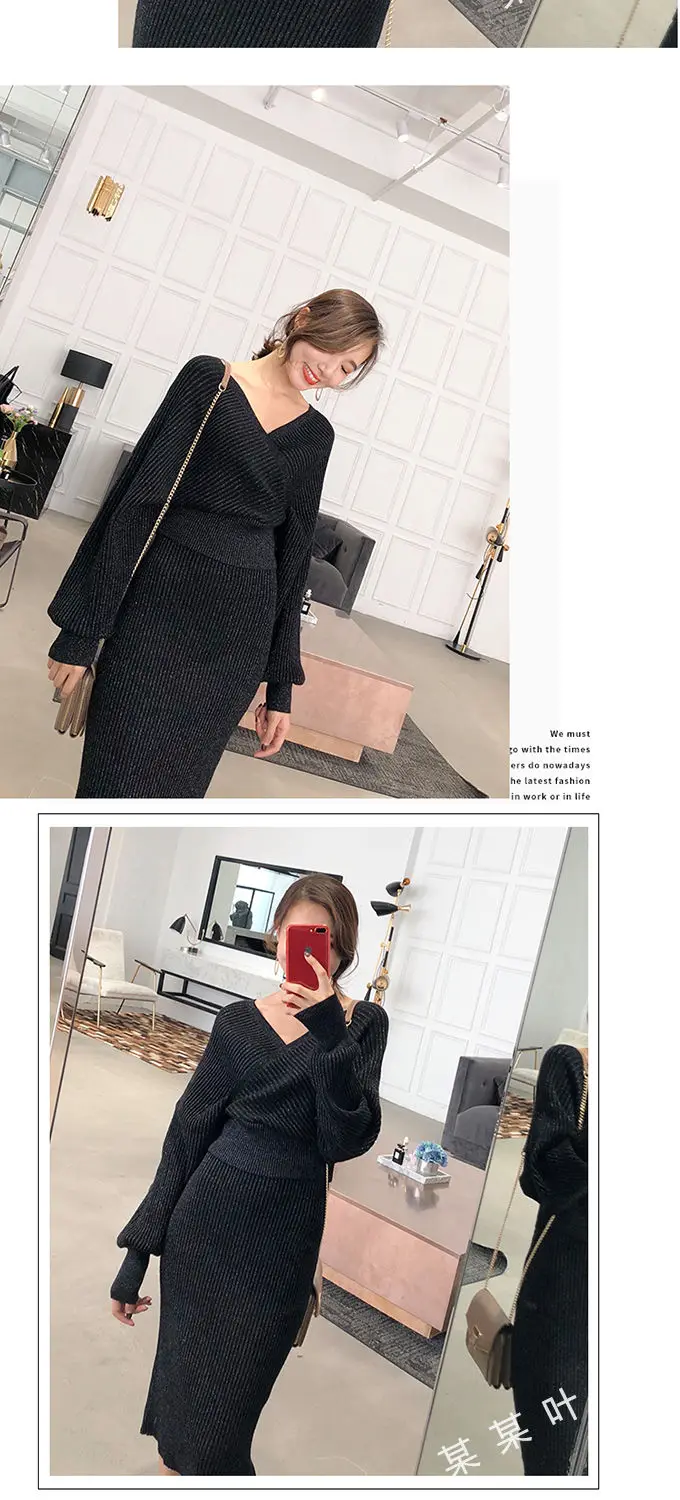 Женский трикотажный костюм, осенний свитер с рукавами-фонариками, v-образным вырезом и эластичной талией, Женский комплект 2 шт., 2019
