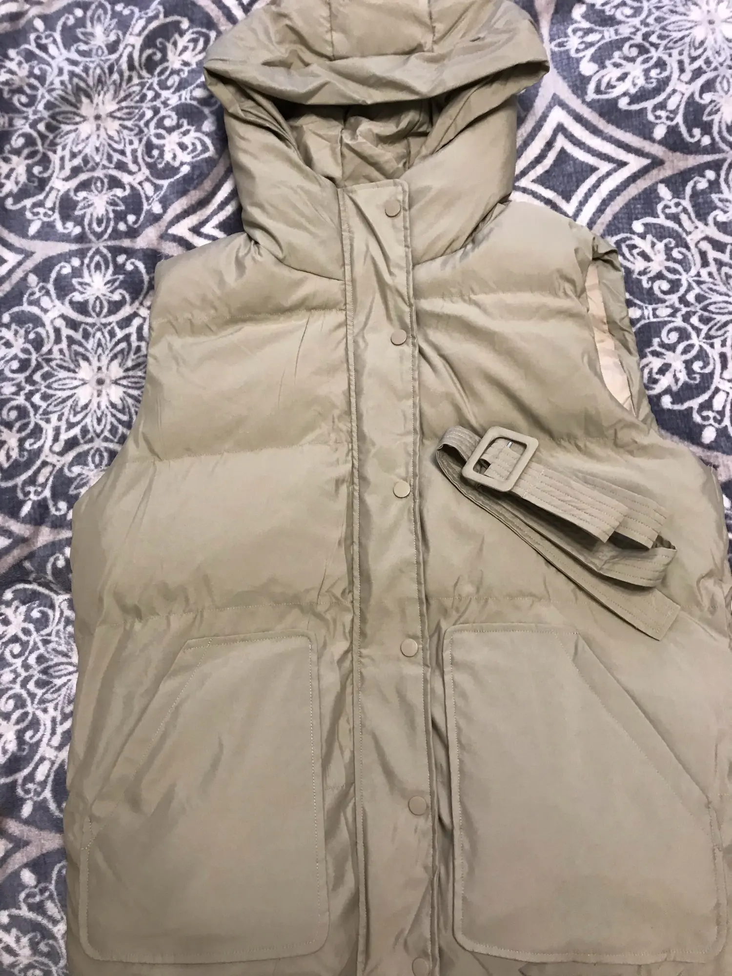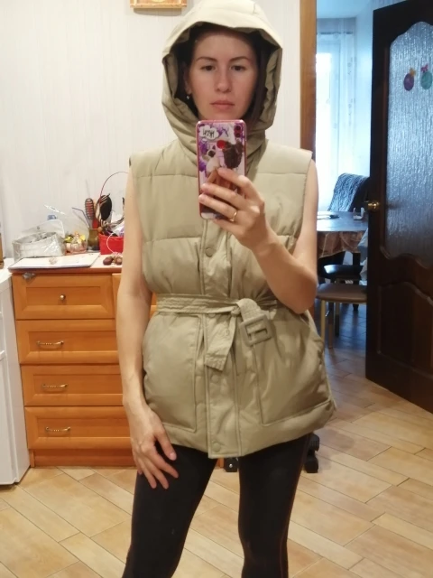 Жилетка тёплая, материал нормальный, брала размер М на рост 167 , очень удобный капюшон, замок хороший, уже ношу около 3х недель, грязь можно и салфеткой оттереть , но есть минус, очень хлипкие заклепки, пришла уже без одной штуки и ещё одна отпала , вообщем это и есть минус, но продавец вернул часть денег за неё , есть пояс ,