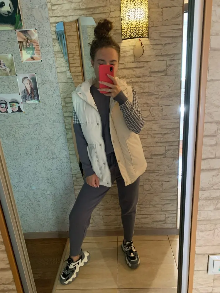 Жилетка Очень понравилась, надеюсь в ней будет тепло. Размер М прям оверсайз на 40 рос размер. На рост 163 чуть прикрывает попу.