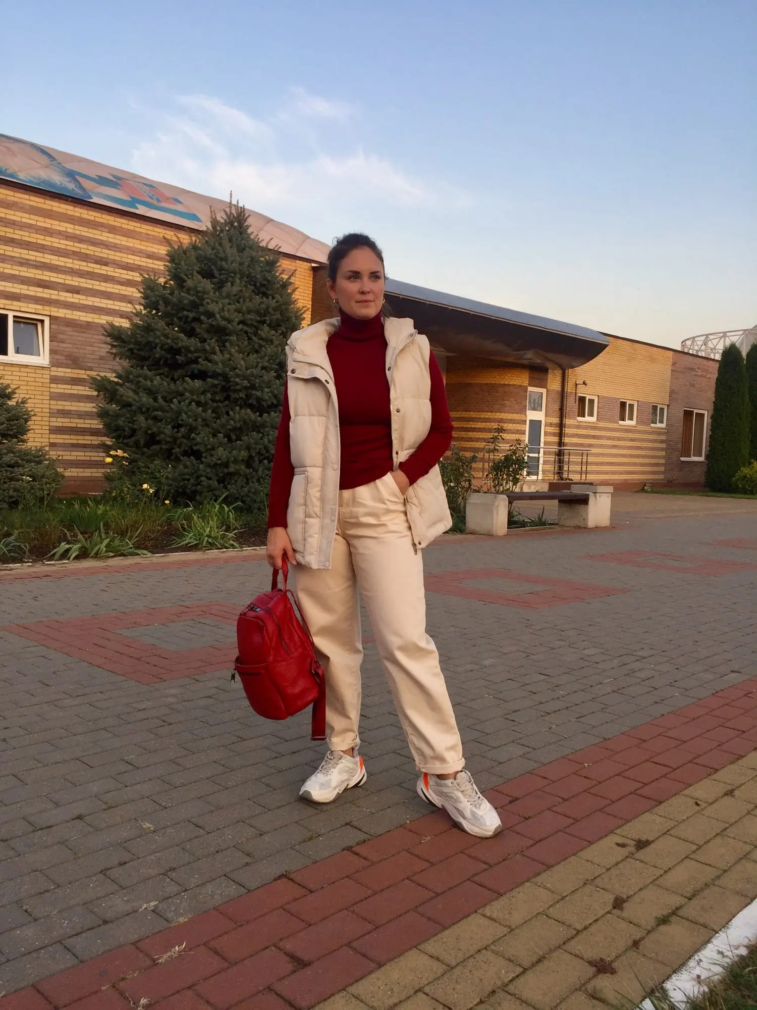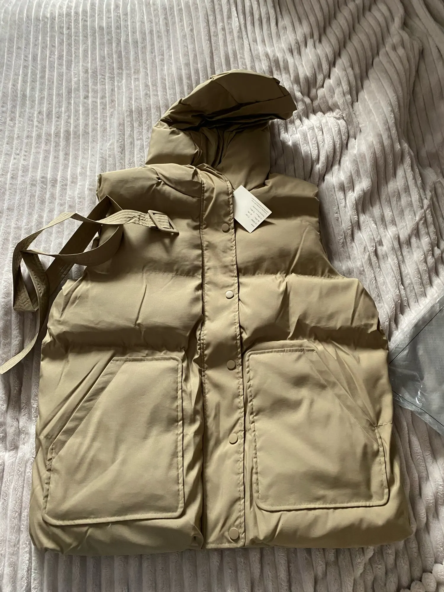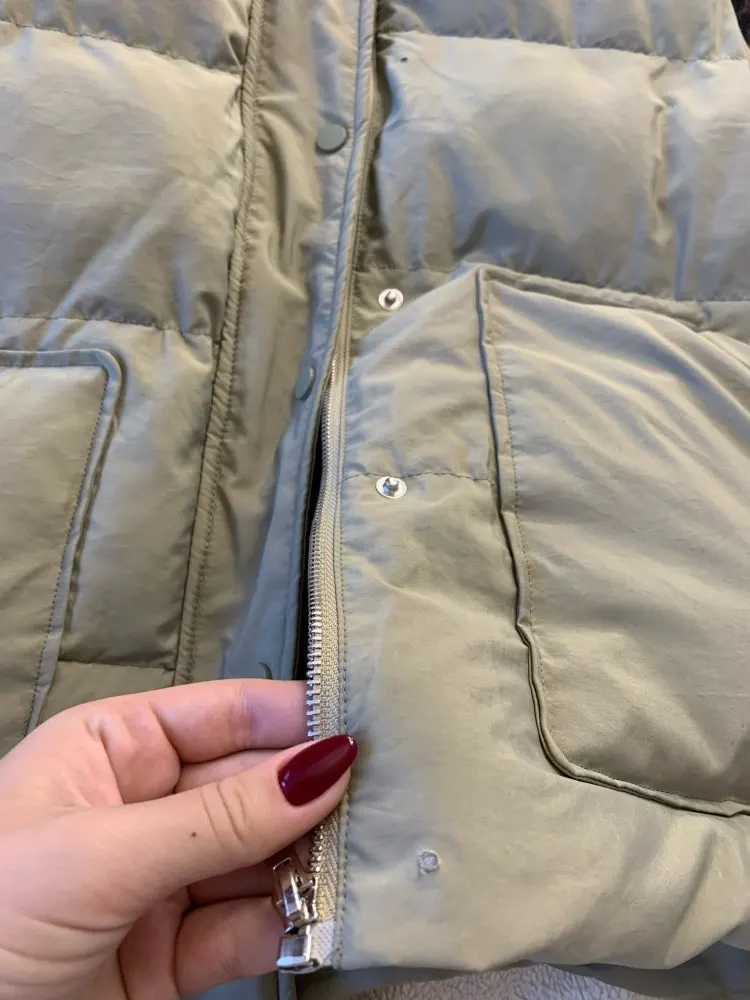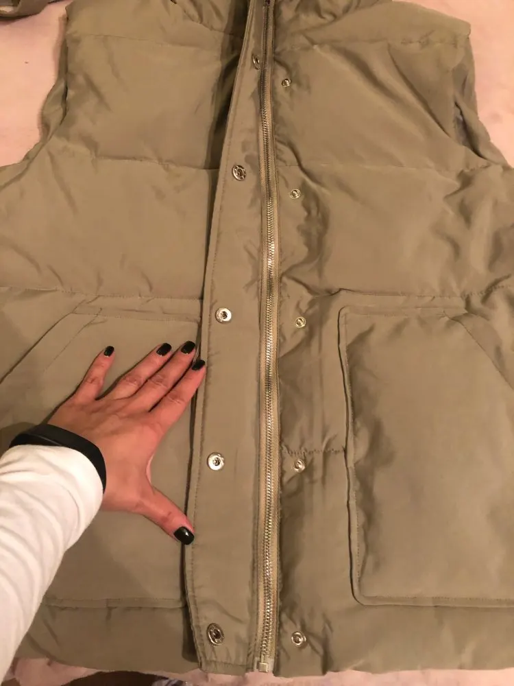 Хороший жилет, плотно набит, фурнитура тоже отличная, на рост 175 не полностью прикрывает попу. Цвет беж почему-то в отзывах у всех разный, у кого-то прямо молочный ближе к белому, мне же пришёл бежевый как на фото продавца, молочным ни при каком освещении он не отдаёт.