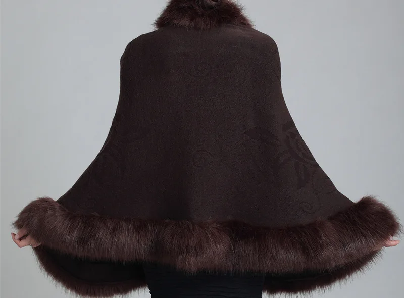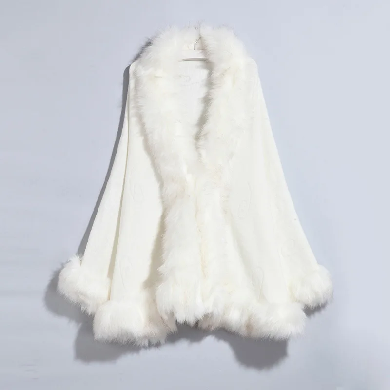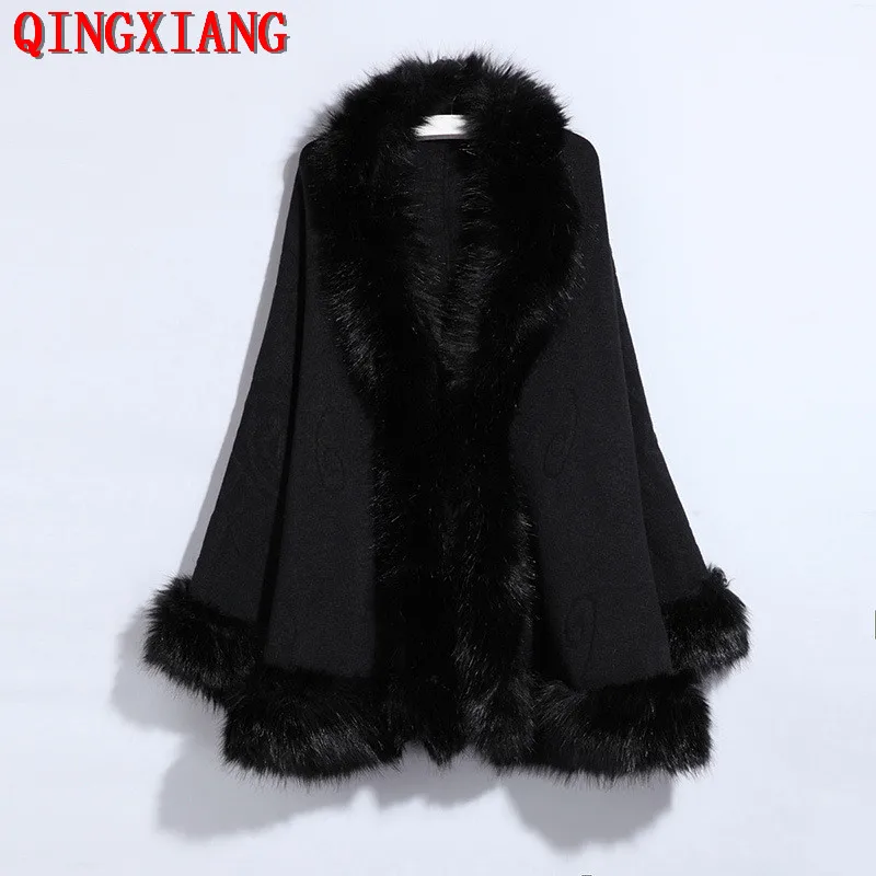 Черное пончо с большим воротником из искусственного лисьего меха, 13 цветов, образец 2019, красная плащ с открытым стежком и длинными рукавами-воланами, шаль, вязаное уличное пальто